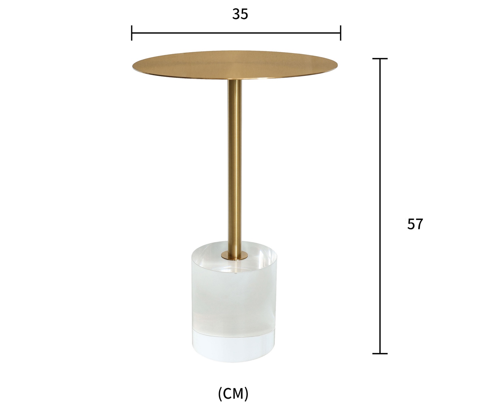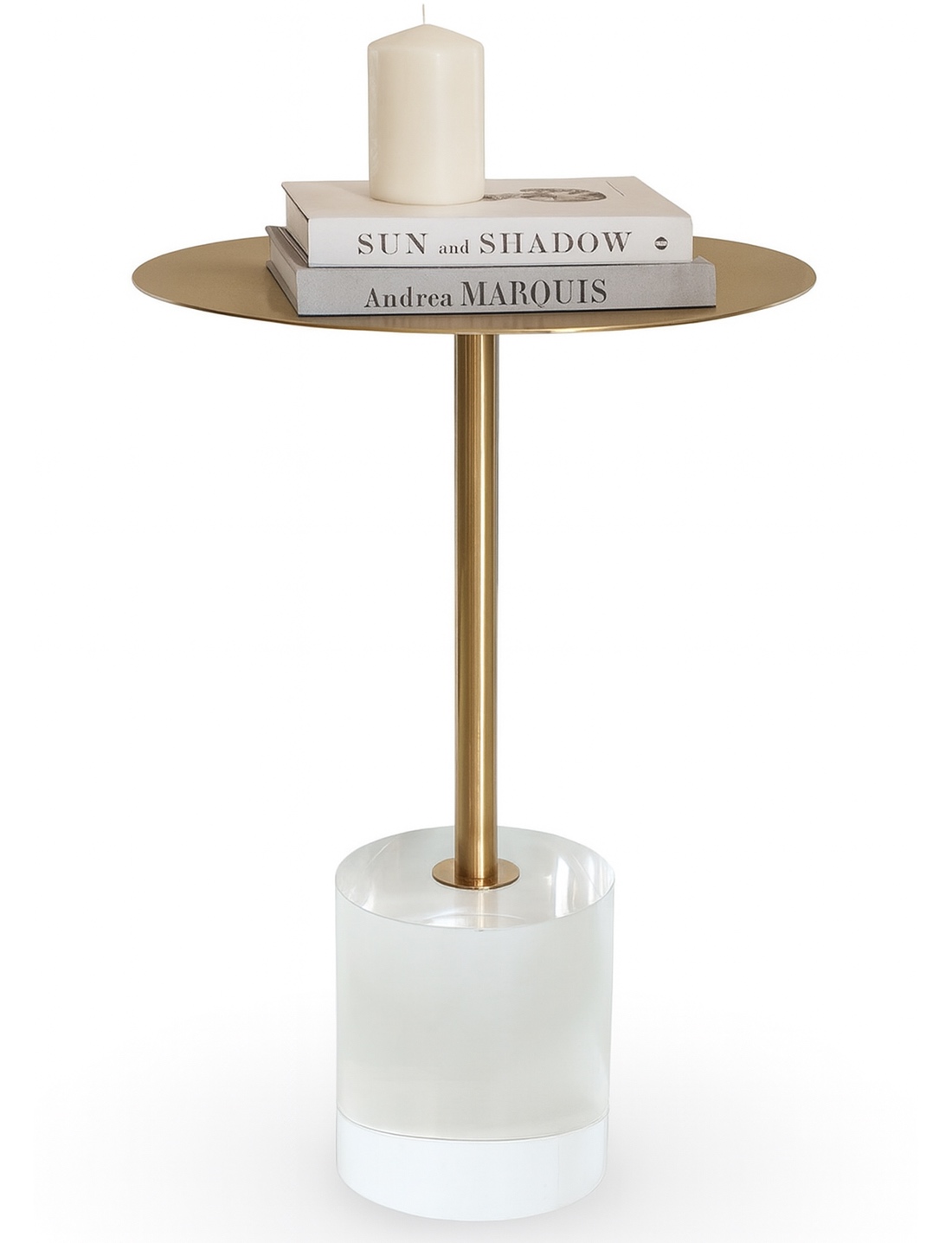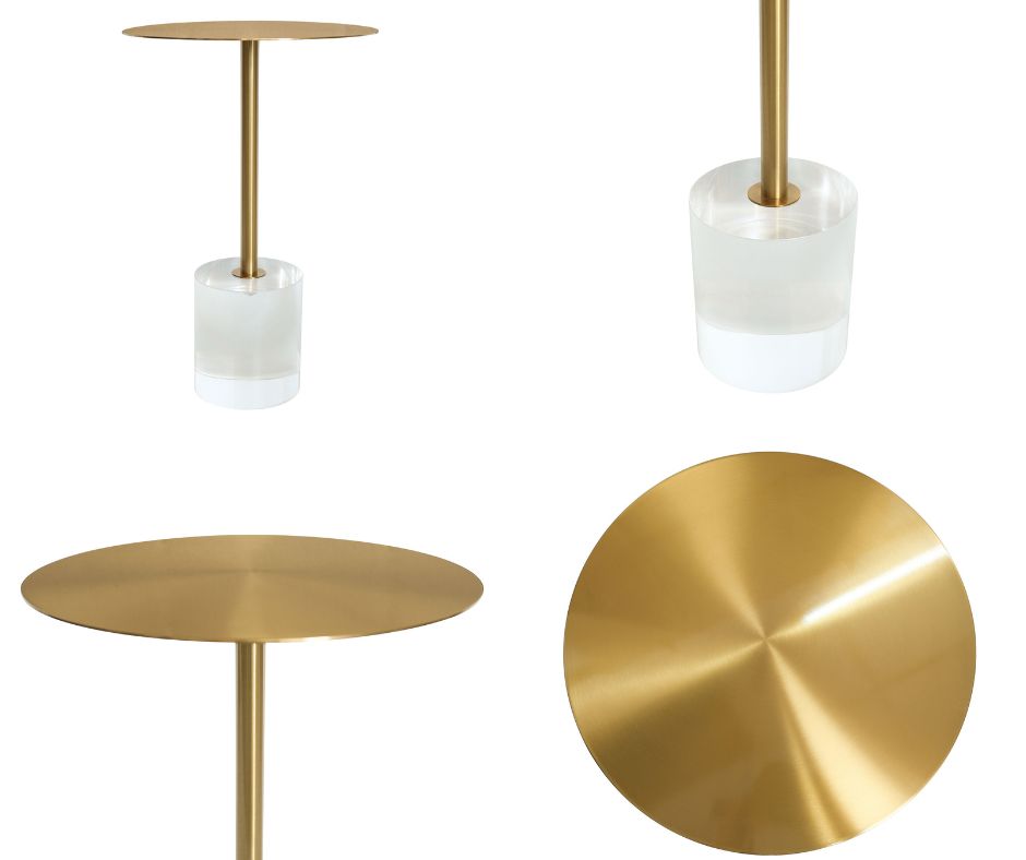 Blat i filar stolika Modig M28 produkowany jest ze stali nierdzewnej w kolorze złotym, natomiast podstawa z przezroczystego akrylu. Jego wykończenie wprowadza do wnętrza efekt luksusu i nowoczesnego designu, a okrągły blat zapewnia wygodę użytkowania i harmonijną aranżację przestrzeni. Stolik M28 świetnie komponuje się z sofami i fotelami w neutralnych kolorach lub z dodatkami w tonacji czerni, bieli i szarości.