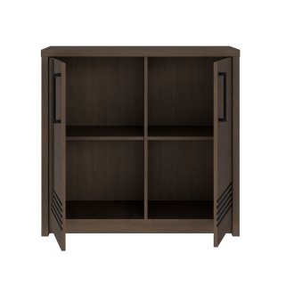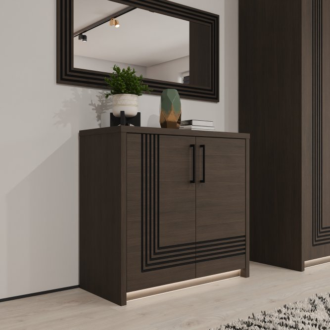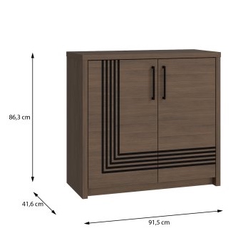 Komoda dwudrzwiowa Eufemius została wykonana z płyty wiórowej w dekorze Dąb Mazurski, co podkreśla jej ponadczasowy charakter. Solidna konstrukcja uzupełniona została o czarne metalowe uchwyty, które w połączeniu z lamelowym zdobieniem nadają całości elegancki, a jednocześnie nowoczesny wygląd. Dzięki systemowi cichego domyku korzystanie z mebla jest wygodne i komfortowe, a opcjonalne oświetlenie LED pozwala dodatkowo wyeksponować jego walory dekoracyjne, szczególnie wieczorami.