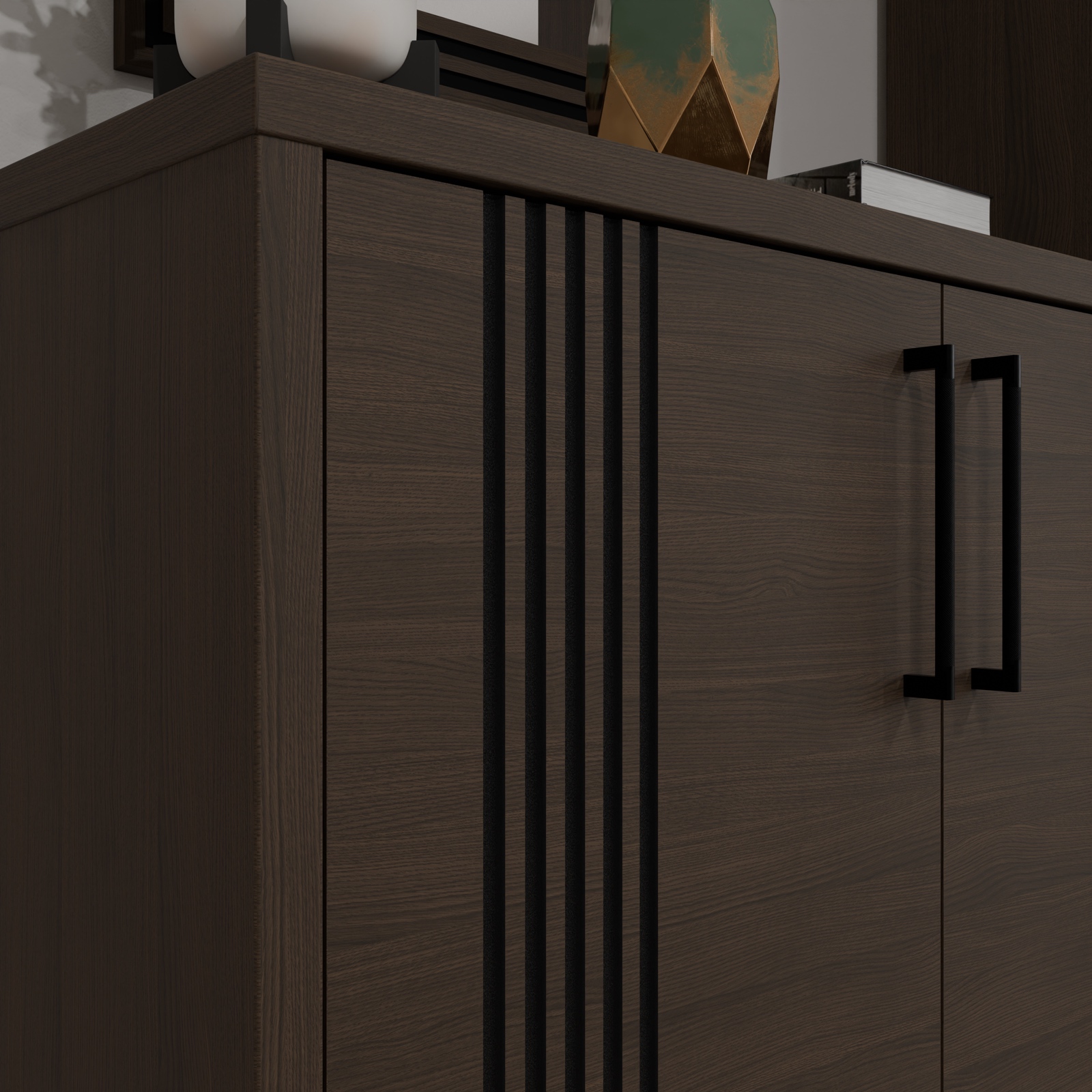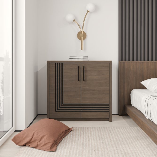 Elegancka forma, efektowne lamele i praktyczna konstrukcja sprawiają, że komoda Eufemius 221L idealnie odnajdzie się w nowoczesnych i klasycznych wnętrzach. Jej wybarwienie w odcieniu Dąb Mazurski nadaje wnętrzu naturalny, ciepły charakter, a czarne detale wprowadzają nutę nowoczesności i lekko industrialny akcent. To mebel, który nie tylko ułatwia przechowywanie, ale także stanowi element dekoracyjny w salonie, sypialni czy jadalni. Dzięki zwartej formie świetnie pasuje zarówno do większych, jak i bardziej kompaktowych przestrzeni.