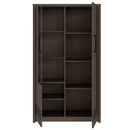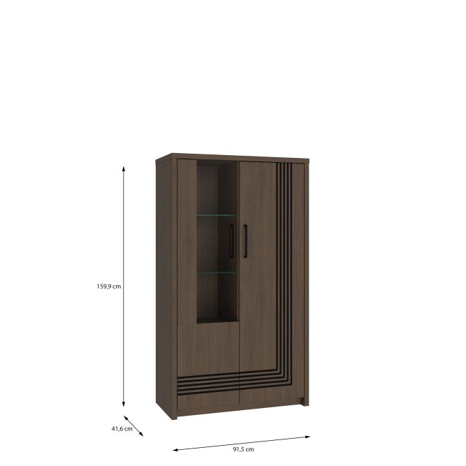 Fronty i korpus witryny Eufemius 621 wykonane są z laminowanej płyty wiórowej w dekorze dąb Mazurski, który pięknie odwzorowuje naturalne usłojenie drewna. Ten wybarwiony odcień dodaje wnętrzu ciepła i przytulności, a jednocześnie doskonale komponuje się z nowoczesnymi dodatkami. Szklane fronty wykonano z bezpiecznego, hartowanego szkła, co pozwala na efektowne oświetlenie ekspozycji. Metalowe uchwyty w kolorze czerni stanowią gustowny kontrast i podkreślają współczesny charakter mebla.
