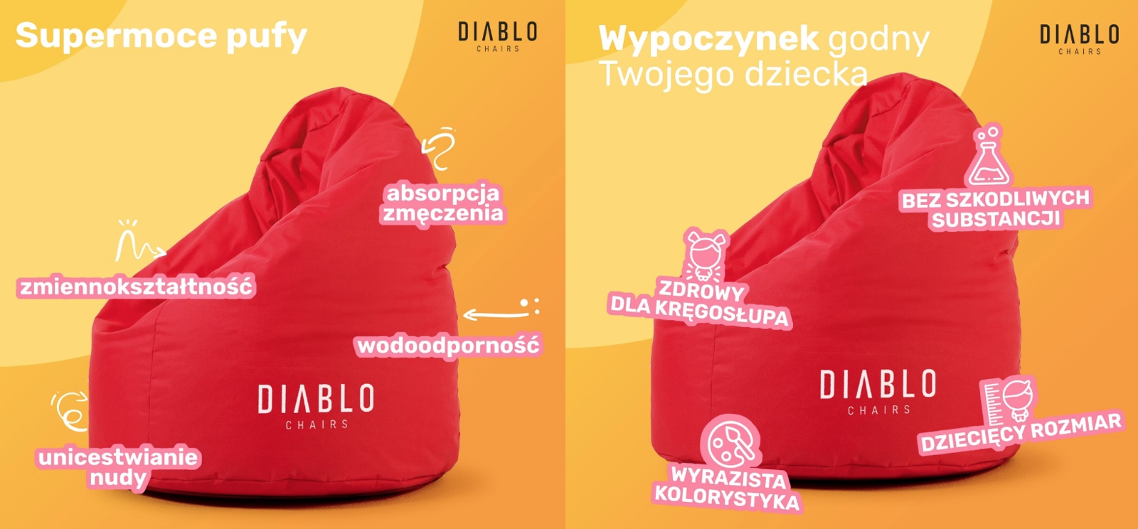 Pufa dziecięca worek dla małych graczy Diablo Chairs to model, który nigdy się nie znudzi! Wypełniona jest milionami kuleczek ze styropianu, przez co może przybierać różne kształty oraz właściwie podpierać całą sylwetkę. Obszycie stanowi czerwona tkanina - kodura. Posiada ponadto ochronną powłokę, która odpowiada za wodoodporność.