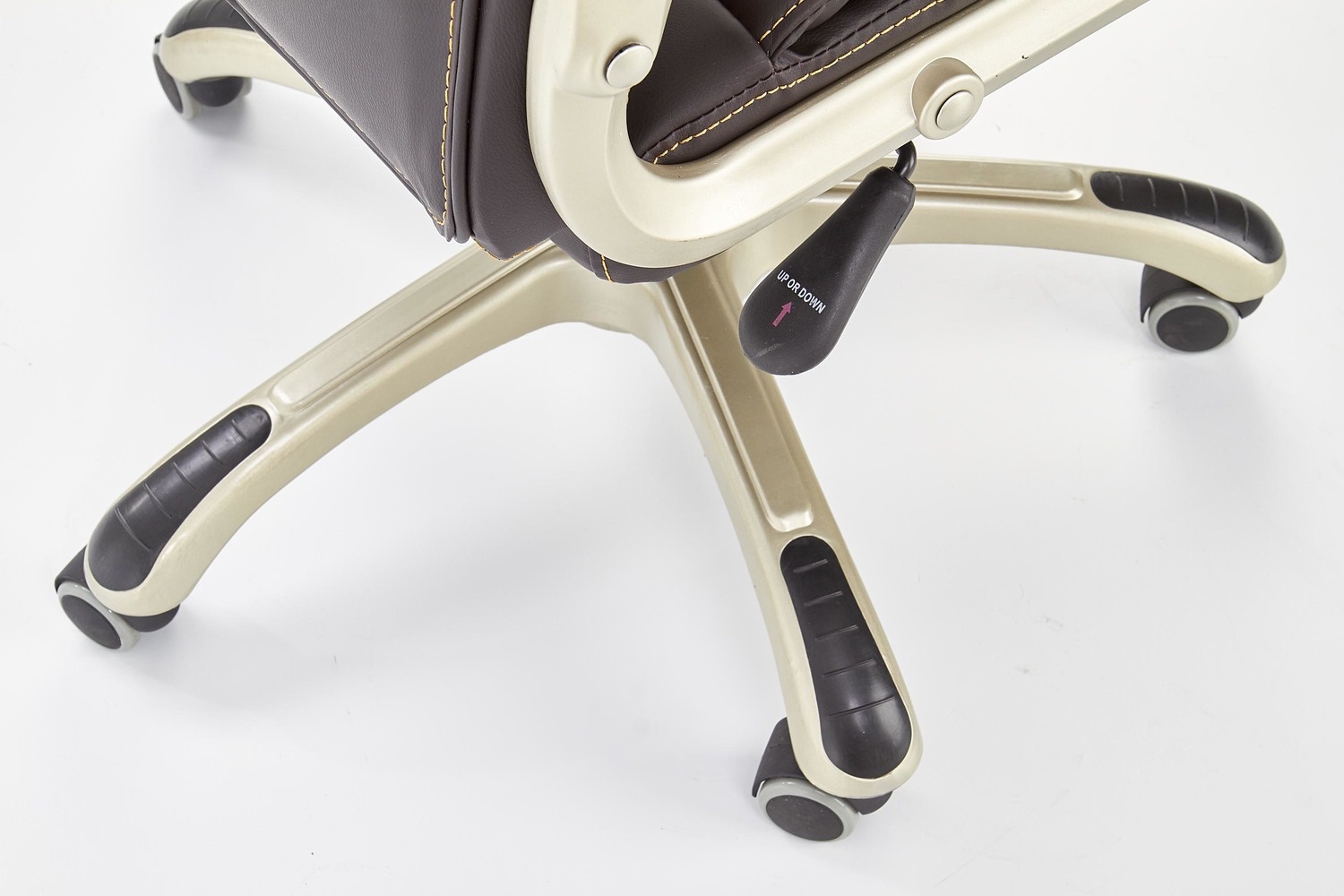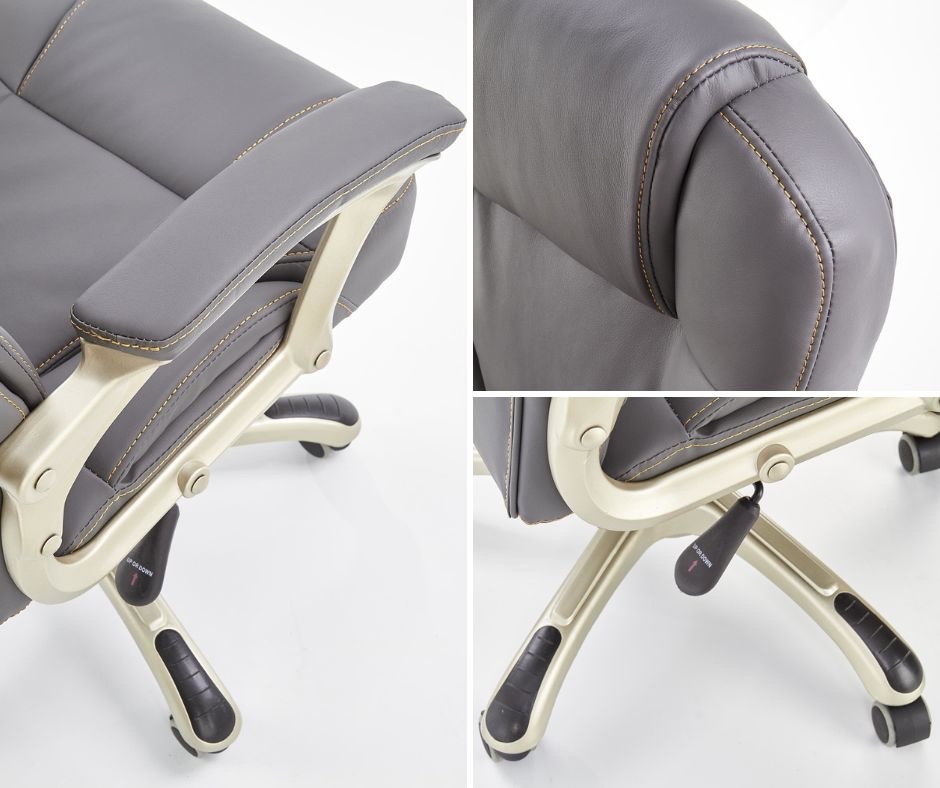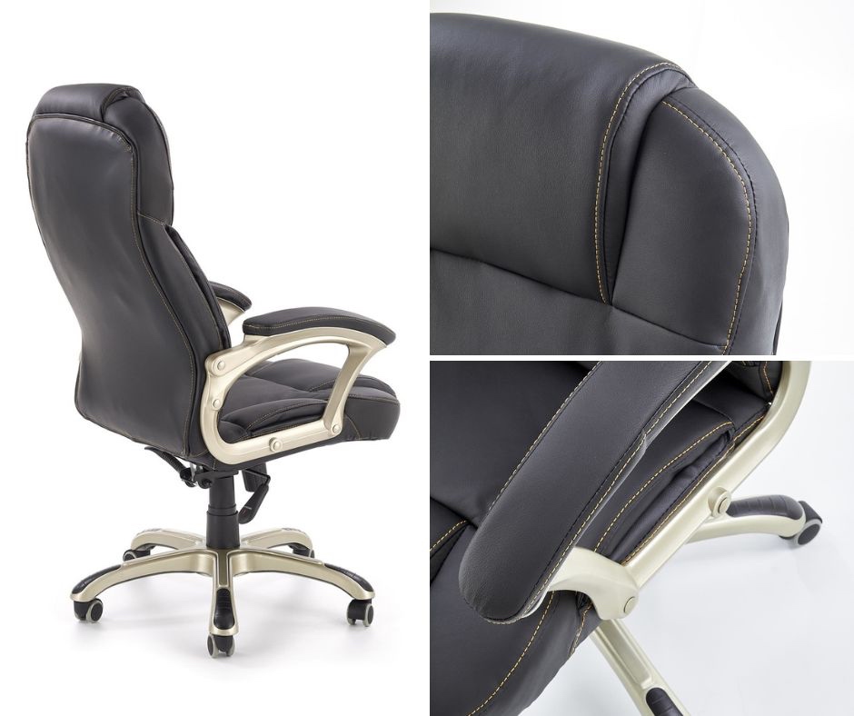 Gabinetowy fotel Desmond od pierwszej chwili budzi prawdziwy respekt i buduje wokół siebie luksusowy klimat - jego nieszablonowy charakter sprawdzi się doskonale w stylowo urządzonych biurach i eleganckich gabinetach. Każdy element tego unikalnego fotela powstał z myślą o maksymalnej wygodzie użytkowania - profilowane siedzisko, oparcie i ergonomiczne podłokietniki pokryto przyjemną w dotyku ekoskórą. Pięcioramienna podstawa zapewnia pełne bezpieczeństwo i urzeka bardzo wyrafinowanym połączeniem czerni i połysku metalu.