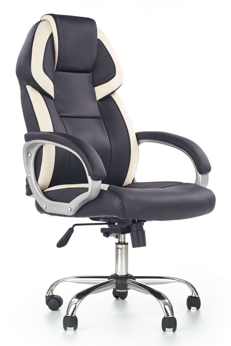 Biurowy fotel obrotowy Barton pokryty jest czarno-białą skórą ekologiczną. Pięcioramienna podstawa wykonana jest z metalu. Materiały wykonania zdecydowanie ułatwiają utrzymanie mebla w czystości.