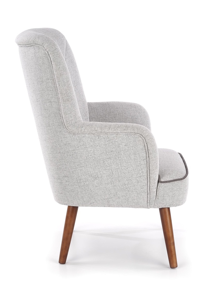 Fotel wypoczynkowy do salonu Bishop tapicerowany jest tkaniną materiałową w kolorze jasny popiel. Podstawa w formie czterech nóg wykonana jest z drewna litego o odcieniu orzech.