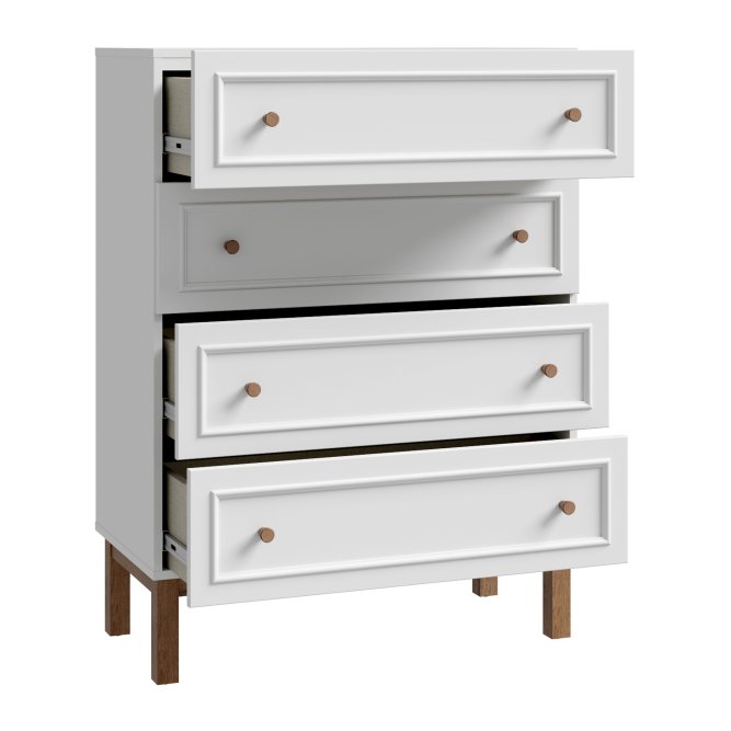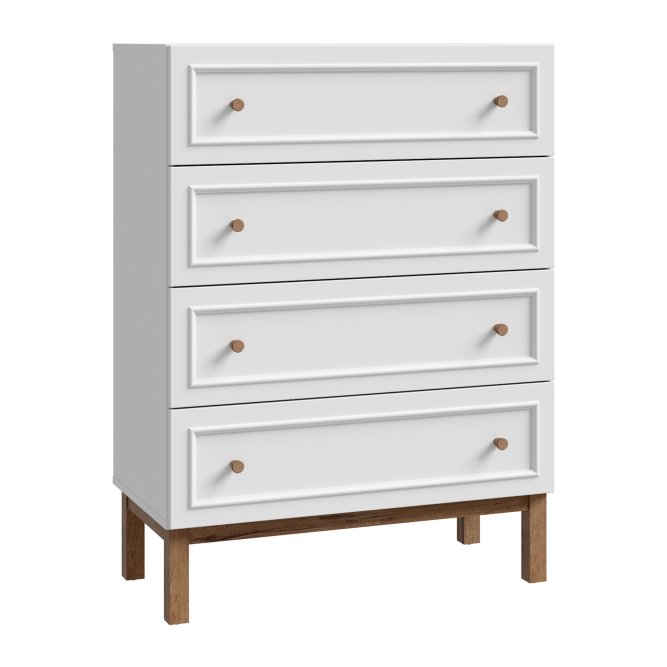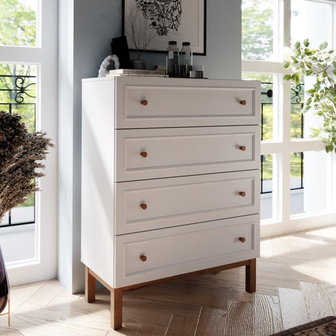 Korpus komody pokojowej Penkridge wykonano z laminowanej płyty meblowej w kolorze Secret Grey, a fronty z płyty MDF, które dodatkowo ozdobiono eleganckimi ramkami. Całość wspiera się na solidnej podstawie z płyty MDF w wybarwieniu dąb szlachetny, co nadaje meblowi lekkości i wizualnej harmonii. Dzięki neutralnej kolorystyce i starannemu wykończeniu komoda doskonale komponuje się zarówno z nowoczesnymi aranżacjami, jak i wnętrzami inspirowanymi stylem klasycznym czy skandynawskim.