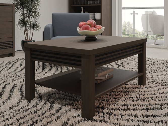 Ława do salonu Eufemius została wykonana z laminowanej płyty wiórowej w dekorze Dąb Mazurski. Wybrane elementy zostały wzmocnione obrzeżem ABS, co podnosi ich estetykę i precyzję wykończenia. Detale w postaci dekoracyjnych lameli doskonale podkreślają nowoczesny charakter mebla, a prosty, funkcjonalny kształt sprawia, że ława staje się uniwersalnym uzupełnieniem przestrzeni dziennych.