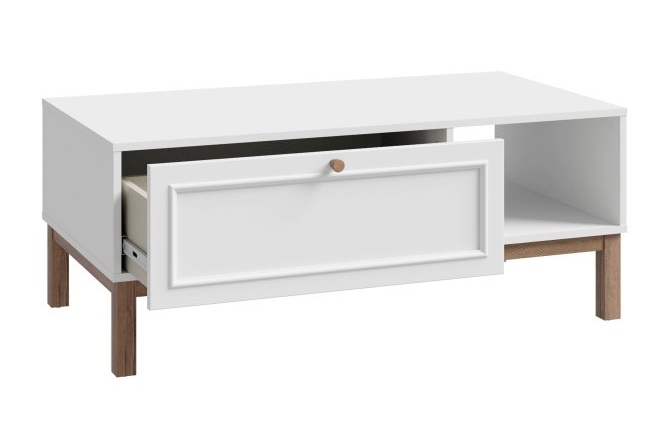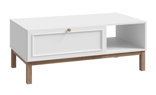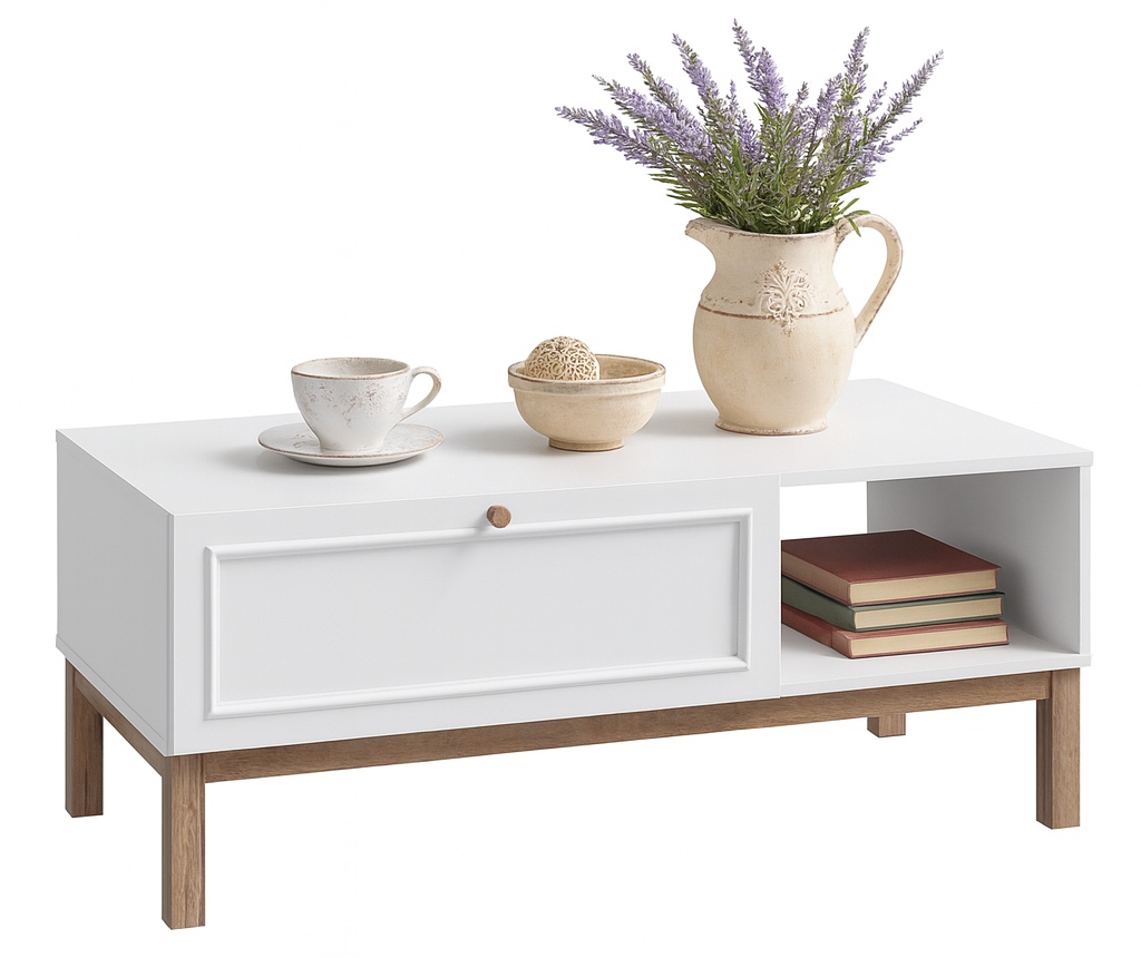 Stylowa i funkcjonalna ława Penkridge doskonale wpisuje się w klimat klasycznych, prowansalskich i nowoczesnych wnętrz! Jej subtelny odcień Secret Grey w połączeniu z ciepłym dębem szlachetnym tworzy elegancki duet, który dodaje przestrzeni lekkości i przytulności. Delikatne ramki na froncie szuflady przywołują na myśl klasyczną sztukaterię, a drewniana gałka stanowi gustowny detal, podkreślający naturalny charakter mebla. To doskonały wybór do salonu, w którym liczy się zarówno estetyka, jak i wygoda użytkowania.