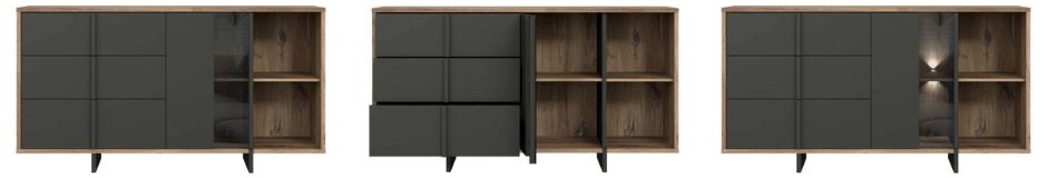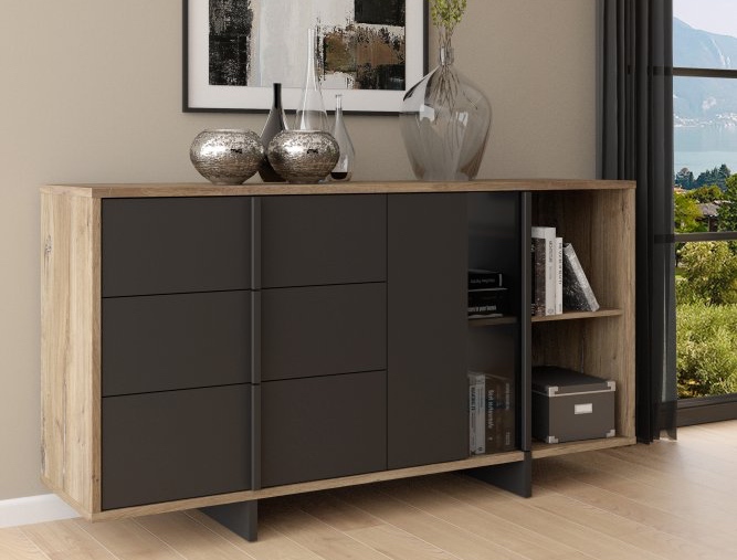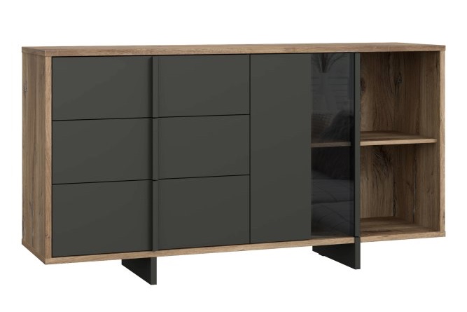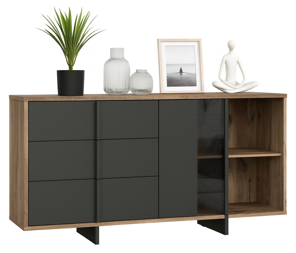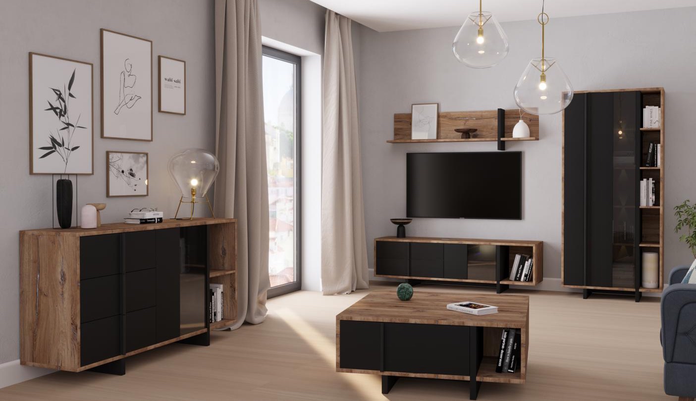 Nowoczesny charakter, loftowy styl i przemyślana funkcjonalność - komoda Jokkaz to propozycja dla osób, które cenią odważne, a zarazem eleganckie rozwiązania we wnętrzach. Jej geometryczna forma i kontrastowe zestawienie kolorów sprawiają, że mebel staje się wyrazistym akcentem w przestrzeni salonu, jadalni lub sypialni. Połączenie naturalnego dekoru drewna z matową czernią nadaje całości industrialnego charakteru, a jednocześnie wprowadza do pomieszczenia ciepło i przytulność. Jokkaz to mebel, który doskonale łączy estetykę z praktycznym przeznaczeniem!