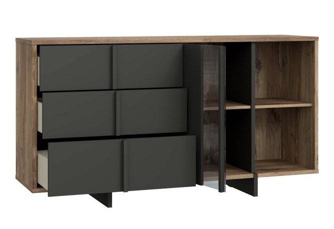 Nowoczesna komoda Jokkaz wykonana została z płyty wiórowej o strukturze odwzorowującej drewno dąb Flagstaff. Obrzeże ABS zapewnia estetyczne wykończenie. Połączenie dekoru drewnopodobnego z czarnymi frontami sprawia, że mebel doskonale wpisuje się w industrialne aranżacje. Szuflady z pełnym wysuwem ułatwiają organizację, a możliwość dokupienia oświetlenia LED pozwala na stworzenie nastrojowej atmosfery po zmroku.