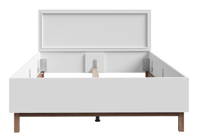 Korpus łóżka do sypialni Penkridge wykonano z laminowanej płyty wiórowej w kolorze Secret Grey, natomiast nóżki i podstawa powstały z płyty MDF w wybarwieniu dąb szlachetny, co nadaje meblowi naturalny charakter. Wybrane elementy konstrukcji zabezpieczono obrzeżem ABS, zwiększającym estetykę wykończenia. Dzięki prostemu, ale eleganckiemu wzornictwu łóżko doskonale komponuje się z innymi elementami kolekcji Penkridge, tworząc spójną i stylową aranżację sypialni. Oferta nie obejmuje materaca.