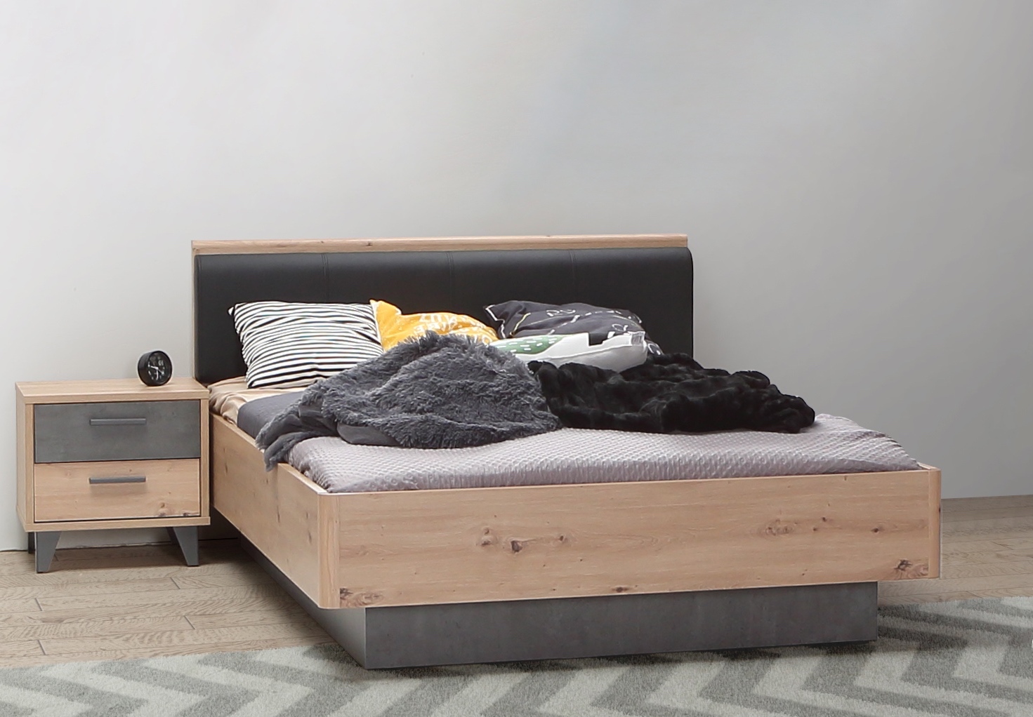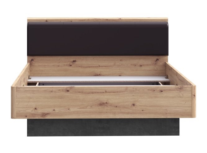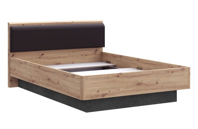 Rama łóżka Raven wykonana została z laminowanej płyty wiórowej w ciepłym dekorze dąb artisan połączonym z chłodnym betonem ciemnoszarym. Wybrane elementy wzmocniono obrzeżem ABS, które zwiększa trwałość krawędzi i podkreśla dopracowane wykończenie mebla. Tapicerowany zagłówek z czarnej ekoskóry, wypełniony pianką PU T21, stanowi stylowy i komfortowy element konstrukcji. Dzięki stonowanej kolorystyce łóżko Raven z łatwością dopasuje się do wielu aranżacji - zarówno tych o nowoczesnym, jak i loftowym charakterze. Oferta nie obejmuje materaca.