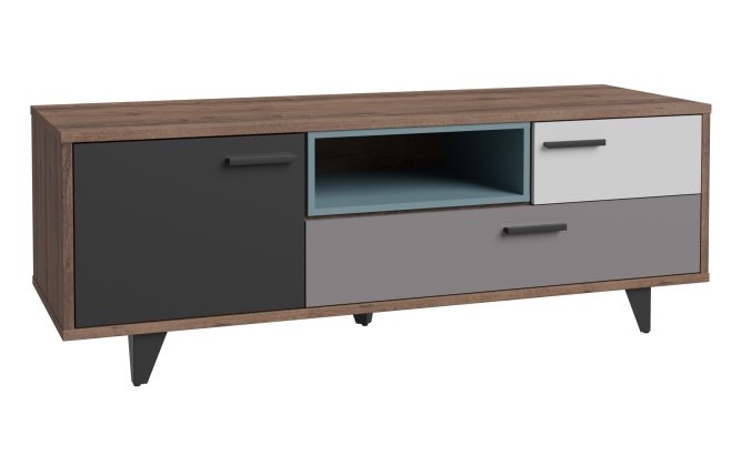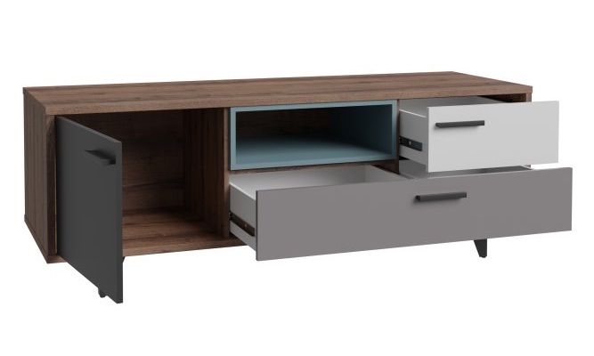 Wieczorne seanse filmowe, spotkania z przyjaciółmi czy chwile relaksu po pracy - każda z tych okazji zasługuje na odpowiednią oprawę. Ten nowoczesny stolik RTV wprowadzi do wnętrza nie tylko harmonię i porządek, ale również styl, który przyciąga wzrok od pierwszego spojrzenia. Ciepły odcień drewna połączony z kolorowymi frontami tworzy efektowny kontrast, idealnie wpisując się w klimat nowoczesnych i młodzieżowych aranżacji. Dzięki przemyślanej konstrukcji z łatwością pomieści sprzęt multimedialny, kolekcję płyt, akcesoria czy drobne dekoracje, zapewniając jednocześnie estetyczny wygląd całej przestrzeni.