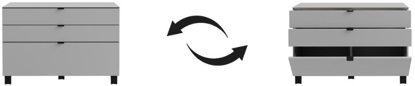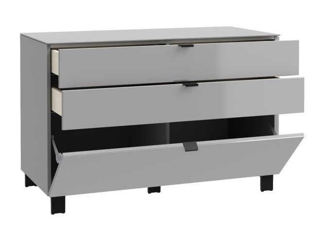 Komoda Poole w odcieniu szarym to nowoczesny mebel, który doskonale odnajdzie się w różnych aranżacjach wnętrz. Jej minimalistyczna forma i gładkie fronty nadają pomieszczeniu eleganckiego charakteru, a zarazem subtelnie podkreślają nowoczesny styl. Dzięki praktycznemu układowi schowków z łatwością zorganizujesz przestrzeń, a system cichego domyku sprawi, że użytkowanie będzie jeszcze bardziej komfortowe. Dwie pojemne szuflady świetnie nadają się do przechowywania drobiazgów, natomiast dolna część z uchylną szafką zapewnia dodatkowe miejsce do uporządkowania większych przedmiotów. To rozwiązanie, które łączy funkcjonalność z ponadczasowym designem.