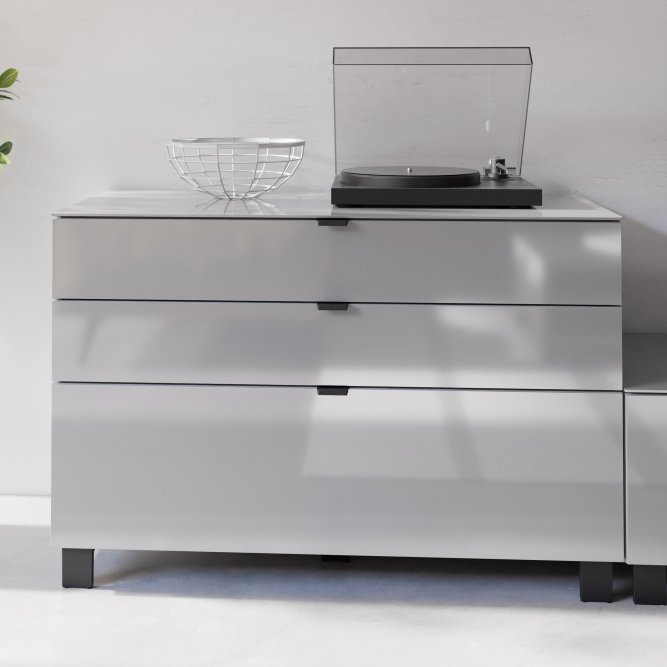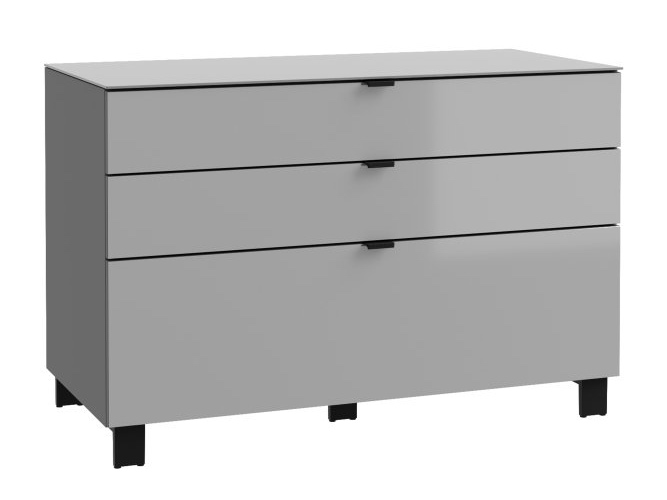Korpus komody pokojowej Poole 211 wykonano z płyty meblowej, co zapewnia stabilność konstrukcji i estetyczny wygląd. Na frontach oraz wieńcu górnym zastosowano szkło Opti w odcieniu jasnoszarym, które dodaje bryle nowoczesnego charakteru i delikatnego połysku. Całość uzupełniają subtelne uchwyty z metalu w czarnym kolorze, a bryłę podpierają proste nóżki wykonane z tworzywa. Dzięki temu komoda nabiera lekkości wizualnej, a jednocześnie pozostaje meblem praktycznym i wygodnym w codziennym użytkowaniu. To idealne połączenie funkcjonalnych rozwiązań i eleganckiej stylistyki.