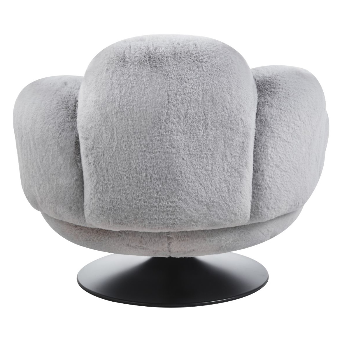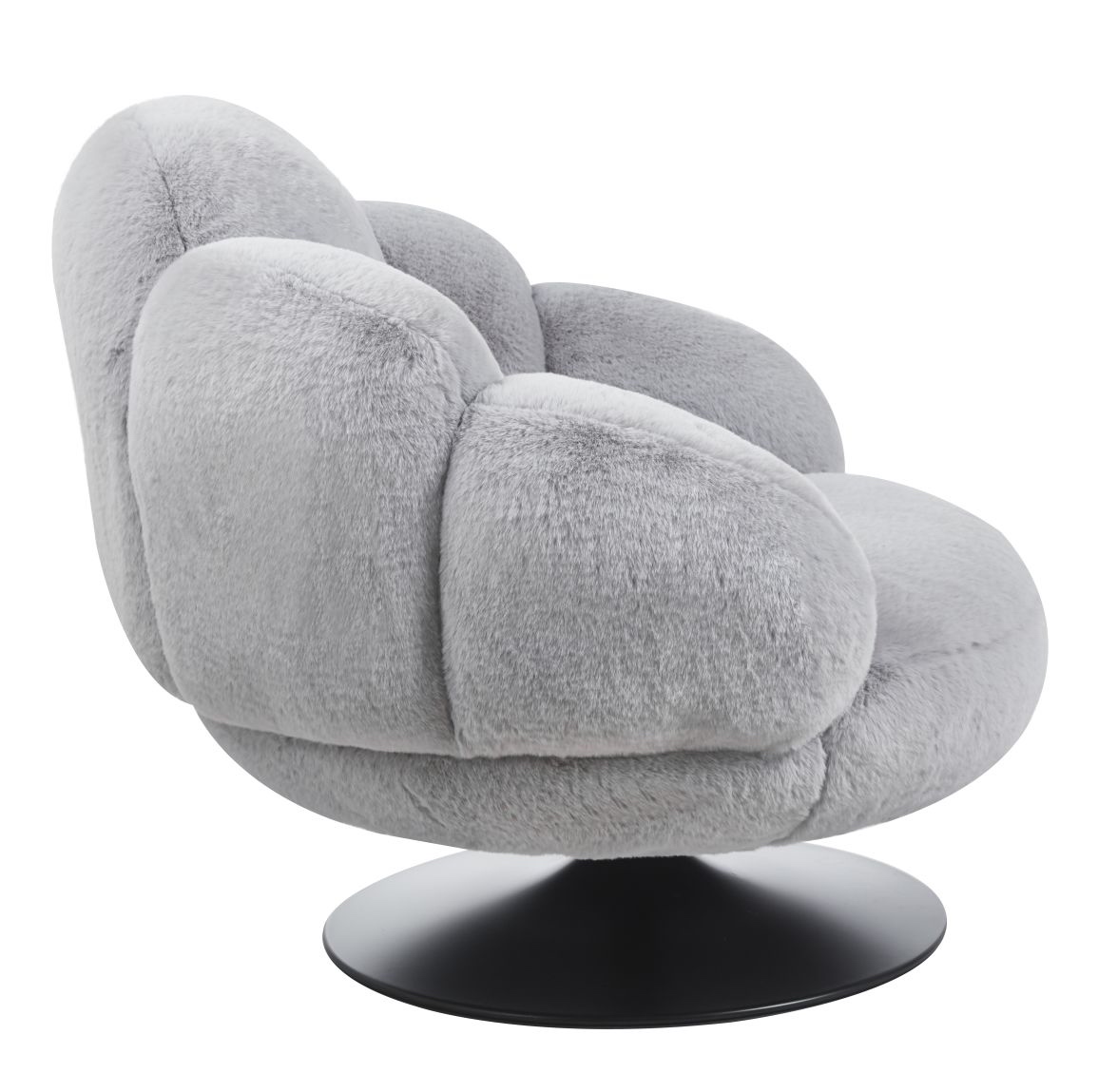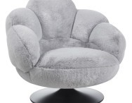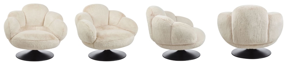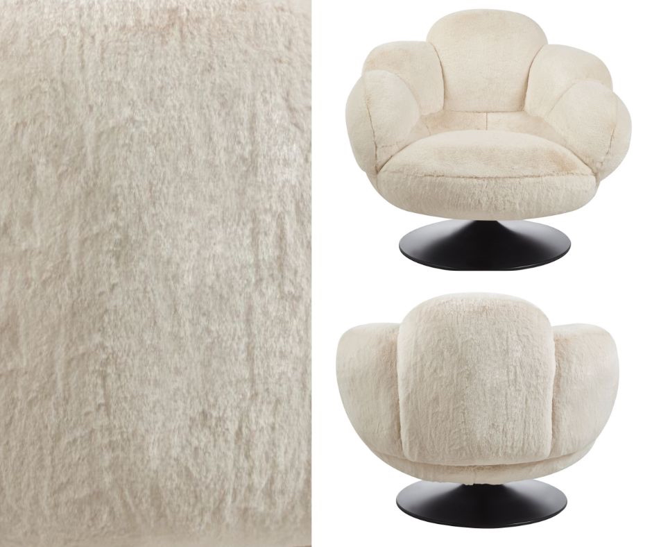 Fotele wypoczynkowe FR8-FX tapicerowane są tkaniną futerkową w kolorze beżowym i szarym do wyboru. Metalowy talerz w czarnym wykończeniu dodaje nowoczesnego charakteru i stanowi solidne oparcie dla szerokiego, miękko wyściełanego siedziska.