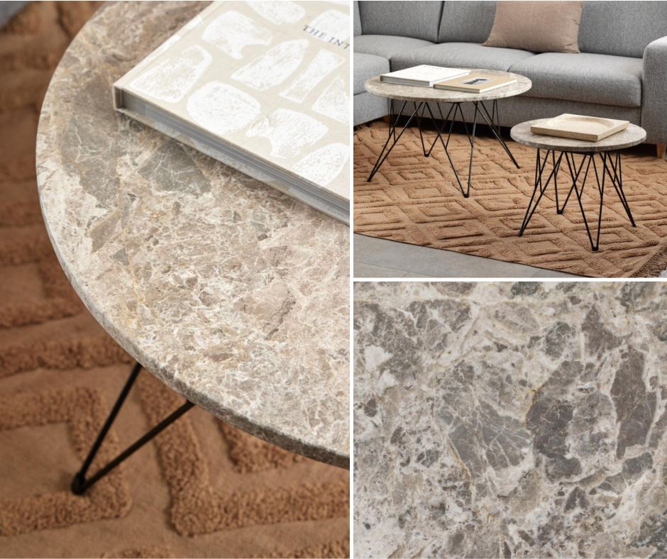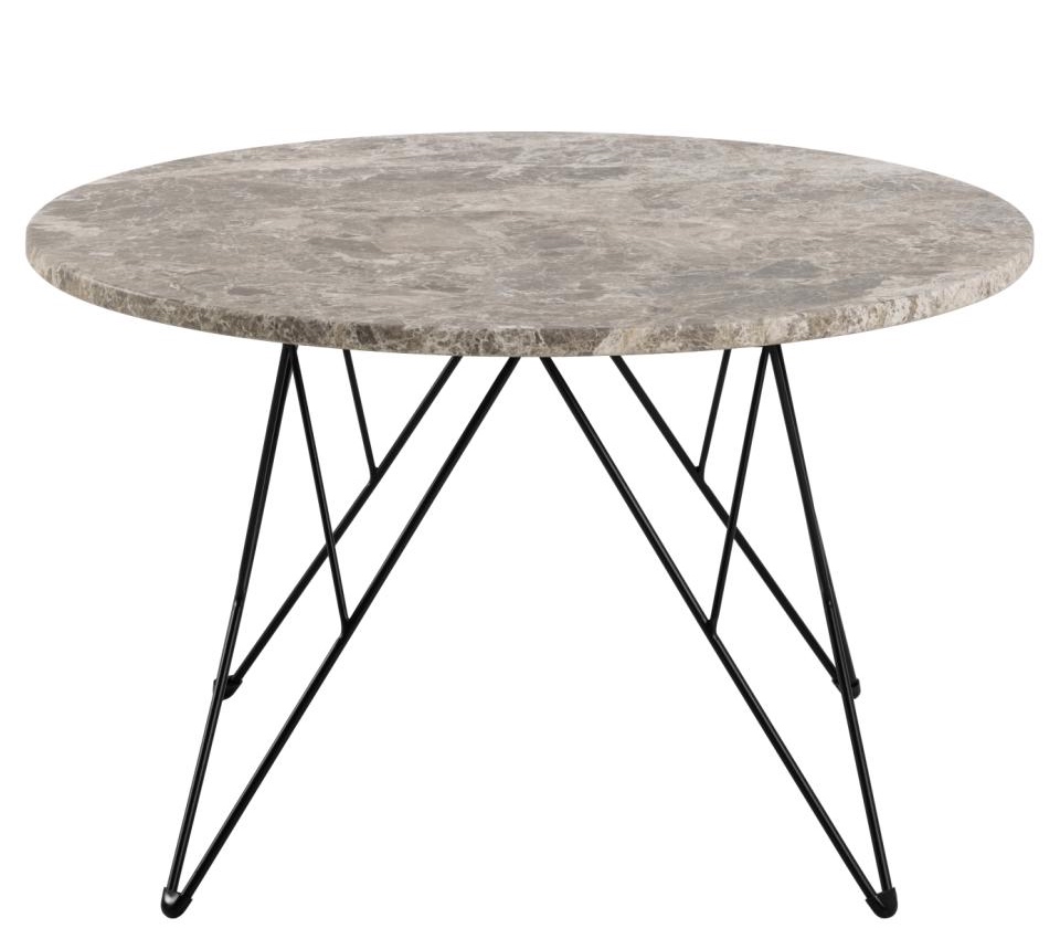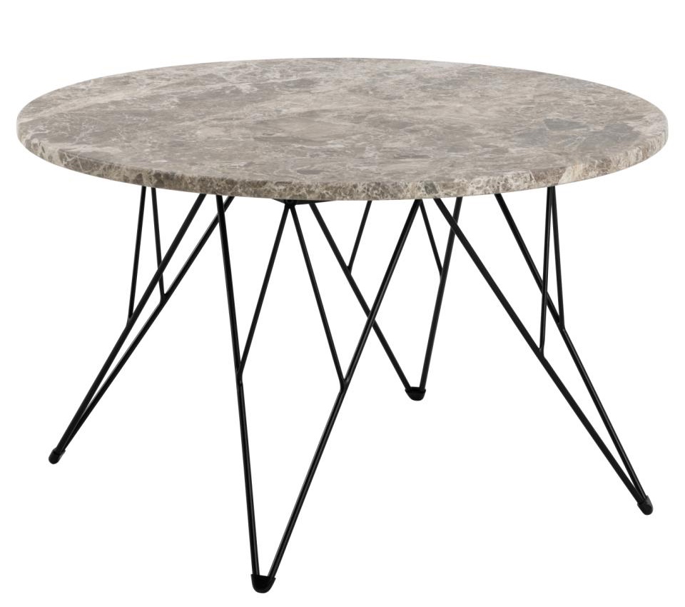 Ławy pokojowe Prunus mają okrągły blat wykonany z matowego marmuru Spider w odcieniu szaro-brązowym, który zachwyca subtelnym rysunkiem kamienia, tworząc efektowną powierzchnię o ponadczasowym uroku. Stabilna podstawa z czarnej, proszkowo malowanej stali ma geometryczną, drucianą formę, która dodaje ławie wizualnej lekkości, jednocześnie zapewniając jej solidność.