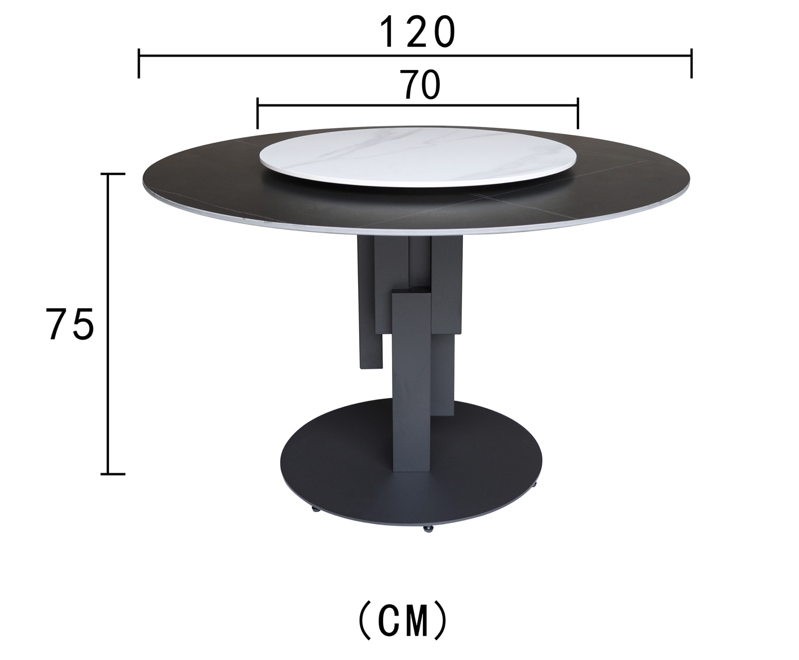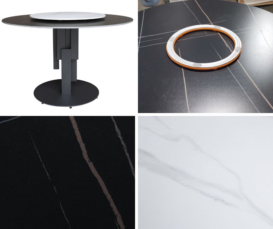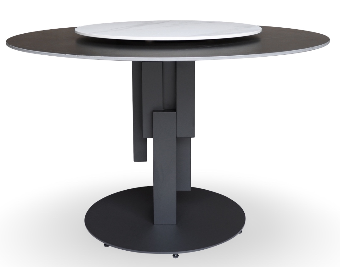 Okrągły stół do jadalni z obrotową nadstawką Modig M21 posiada blat ze spieku kamienia w kolorze białym i czarnym imitującym marmur oraz podstawę z czarnej stali węglowej. Takie stoły do jadalni to idealne połączenie elegancji i praktyczności. Dzięki obrotowej nadstawce stół staje się wyjątkowo funkcjonalny podczas rodzinnych obiadów, przyjęć czy kolacji z przyjaciółmi.