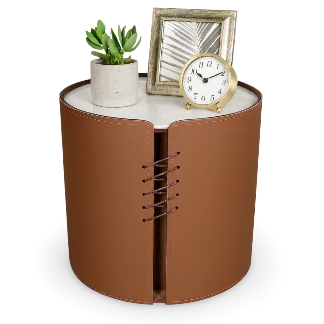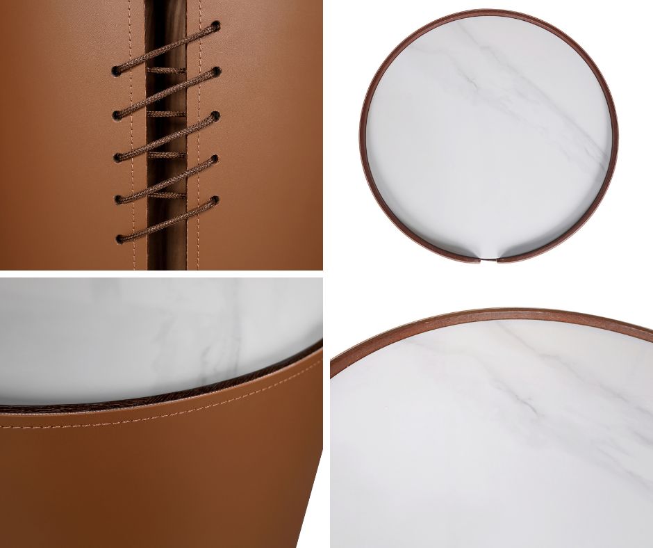 Designerski stolik pomocniczy Modig M35 posiada blat ze spieku kamienia w imitacji białego marmuru, wykończony połyskiem, natomiast pozostała część wykonana jest ze sklejki z drewna topoli i ekoskóry w kolorze siena palona. Stolik zaprojektowany jest z dbałością o każdy detal, tak by łączyć nowoczesną formę z eleganckim wykończeniem. Ozdobne wiązanie umieszczone z boku nadaje meblowi lekko rzemieślniczego charakteru, dzięki czemu takie stoliki pomocnicze wyglądają wyjątkowo.