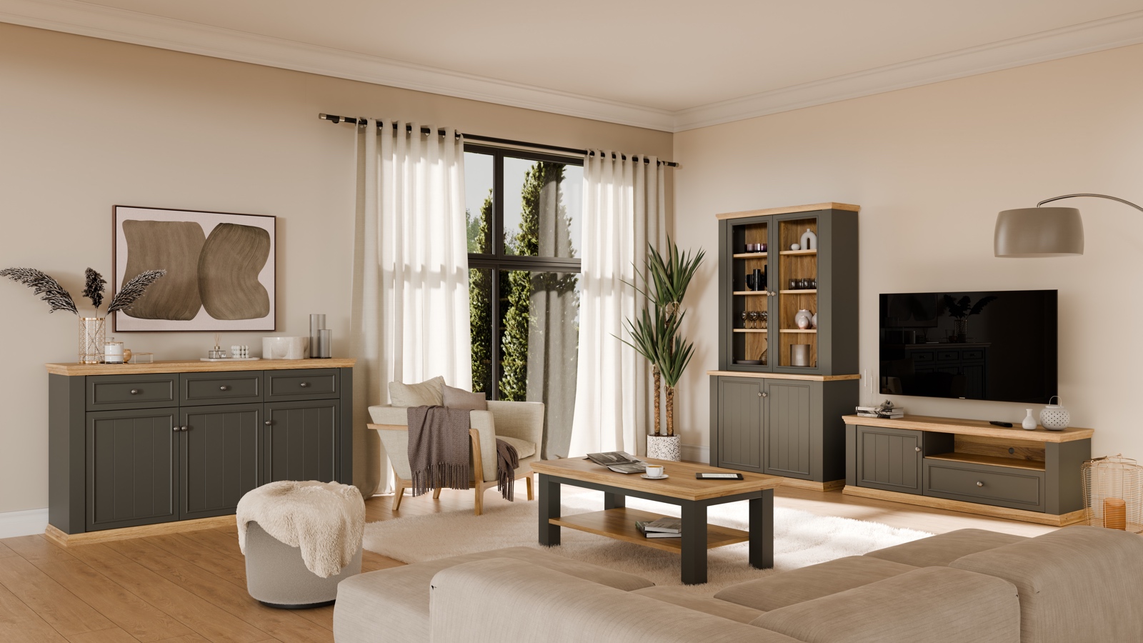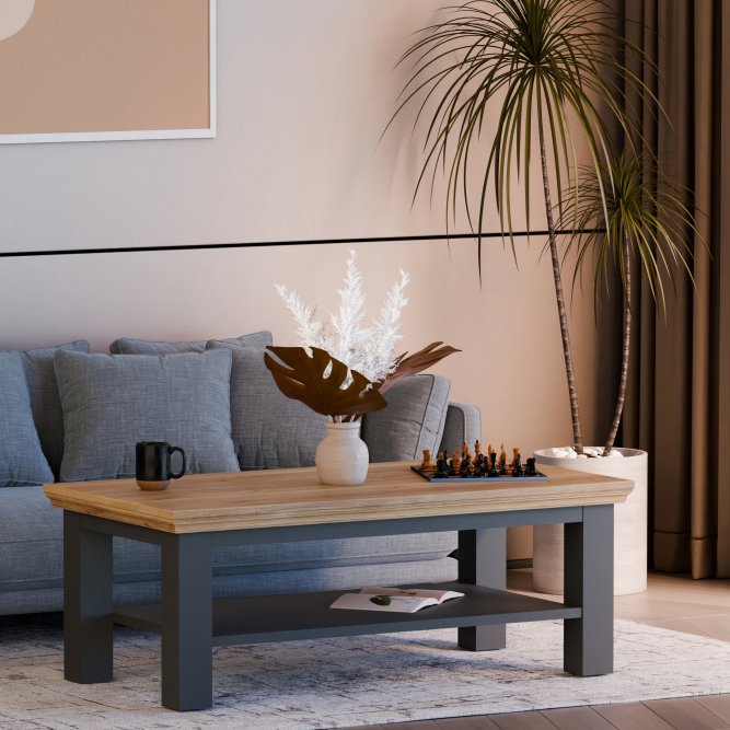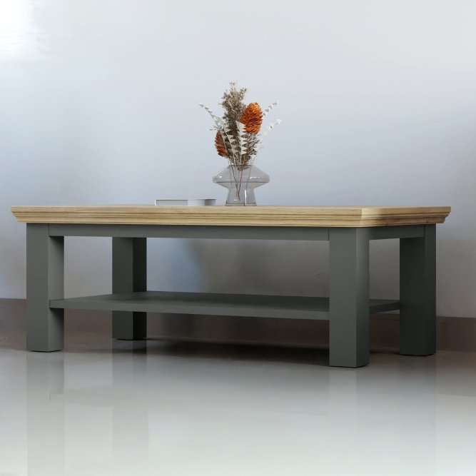 Nowoczesny salon potrzebuje mebla, który będzie zarówno praktyczny, jak i estetyczny. Ława Pontypool doskonale łączy funkcjonalność z eleganckim designem, tworząc przytulny i harmonijny akcent w przestrzeni dziennej. Jej prostokątny blat o wyraźnym rysunku drewna dodaje wnętrzu ciepła, a szara, matowa podstawa wprowadza nutę nowoczesnej elegancji. To mebel, który idealnie sprawdzi się podczas spotkań z rodziną, relaksu przy kawie czy wieczornego seansu filmowego.