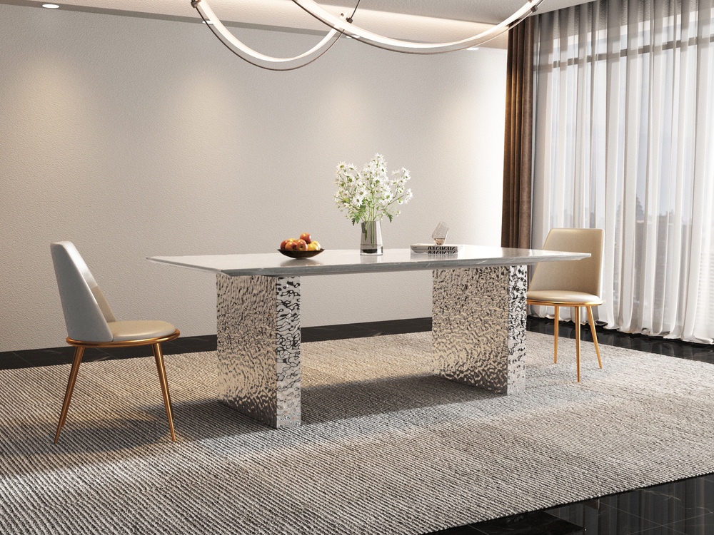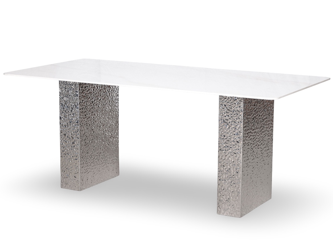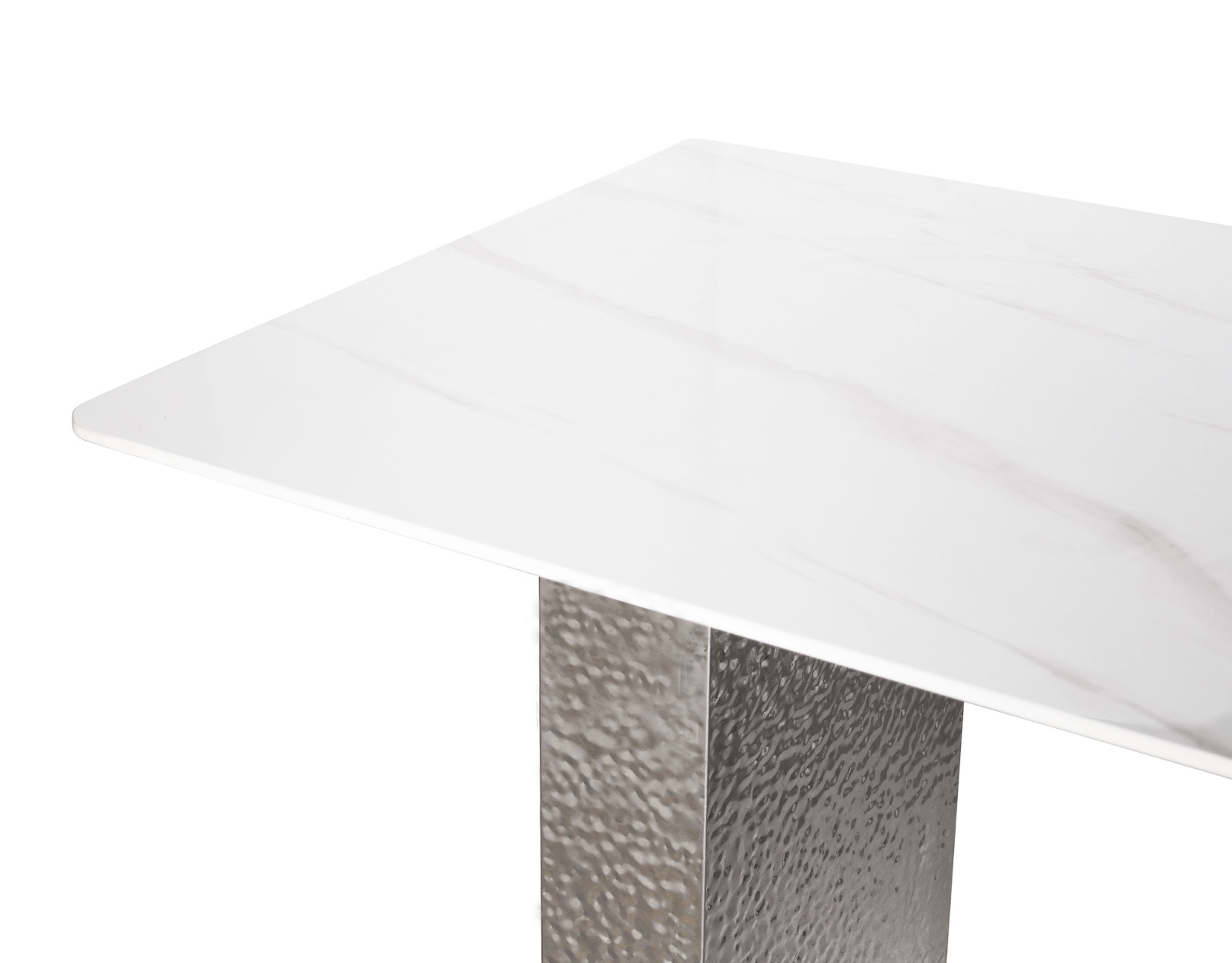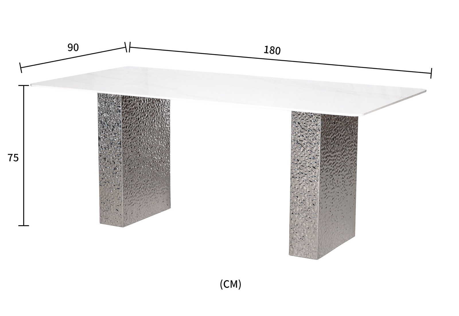 Stół do jadalni w stylu glamour Modig M24 posiada blat z ceramiki z nadrukiem imitującym strukturę marmuru wykończonym szkliwem na wysoki połysk oraz srebrną podstawę ze stali nierdzewnej o chromowanym wykończeniu. Stół Modig M24 to połączenie stylu i funkcjonalności, które sprawdzi się zarówno podczas codziennych posiłków, jak i rodzinnych spotkań. Dzięki minimalistycznej formie stół doskonale komponuje się z różnymi rodzajami krzeseł i dodatków, pozwalając stworzyć spójną i harmonijną aranżację jadalni lub salonu.