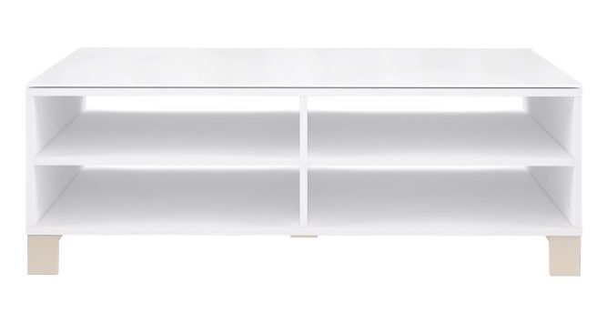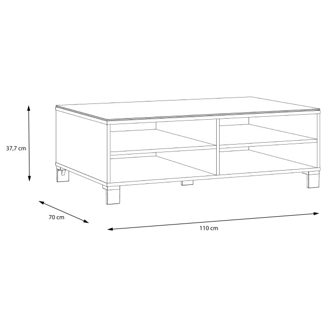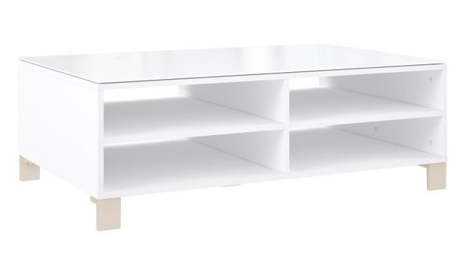 Do wykonania stolika kawowego Poole wykorzystano szkło hartowane w odcieniu białym lakierowanym, które wieńczy blat i dodaje mu nowoczesnego charakteru. Korpus utrzymany jest w białym dekorze, a całość wspierają nóżki z tworzywa w kolorze stal szlachetna, zapewniające stabilność i subtelny kontrast. Cztery praktyczne wnęki umieszczone pod blatem pozwalają wygodnie przechowywać prasę, piloty czy książki, co ułatwia utrzymanie porządku w przestrzeni dziennej.
