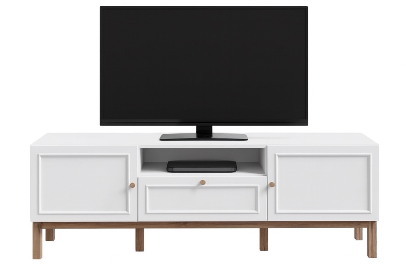 Korpus stolika pod telewizor Penkridge wykonano z płyty wiórowej w wybarwieniu Secret Grey, a fronty z płyty MDF, co pozwoliło uzyskać elegancką powierzchnię z delikatnym frezowaniem. Wybrane elementy wykończono obrzeżem ABS, które chroni je przed codziennym użytkowaniem. Przemyślany układ schowków zapewnia dużo miejsca na akcesoria RTV, płyty czy dekoracje, a blat bez problemu pomieści telewizor o przekątnej do 70 cali. Dodatkowym atutem jest cichy domyk drzwi i szuflady, który podkreśla komfort użytkowania. Całość spoczywa na drewnianej podstawie w kolorze dębu szlachetnego, wprowadzającej naturalny akcent do kompozycji.