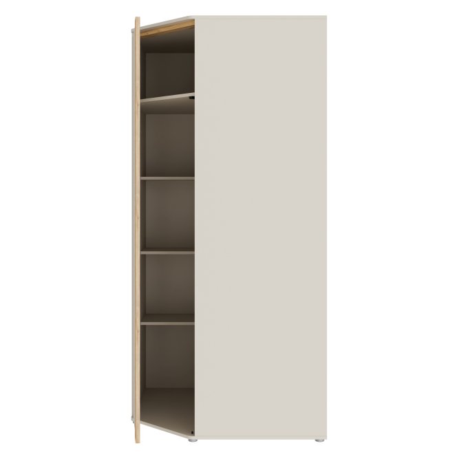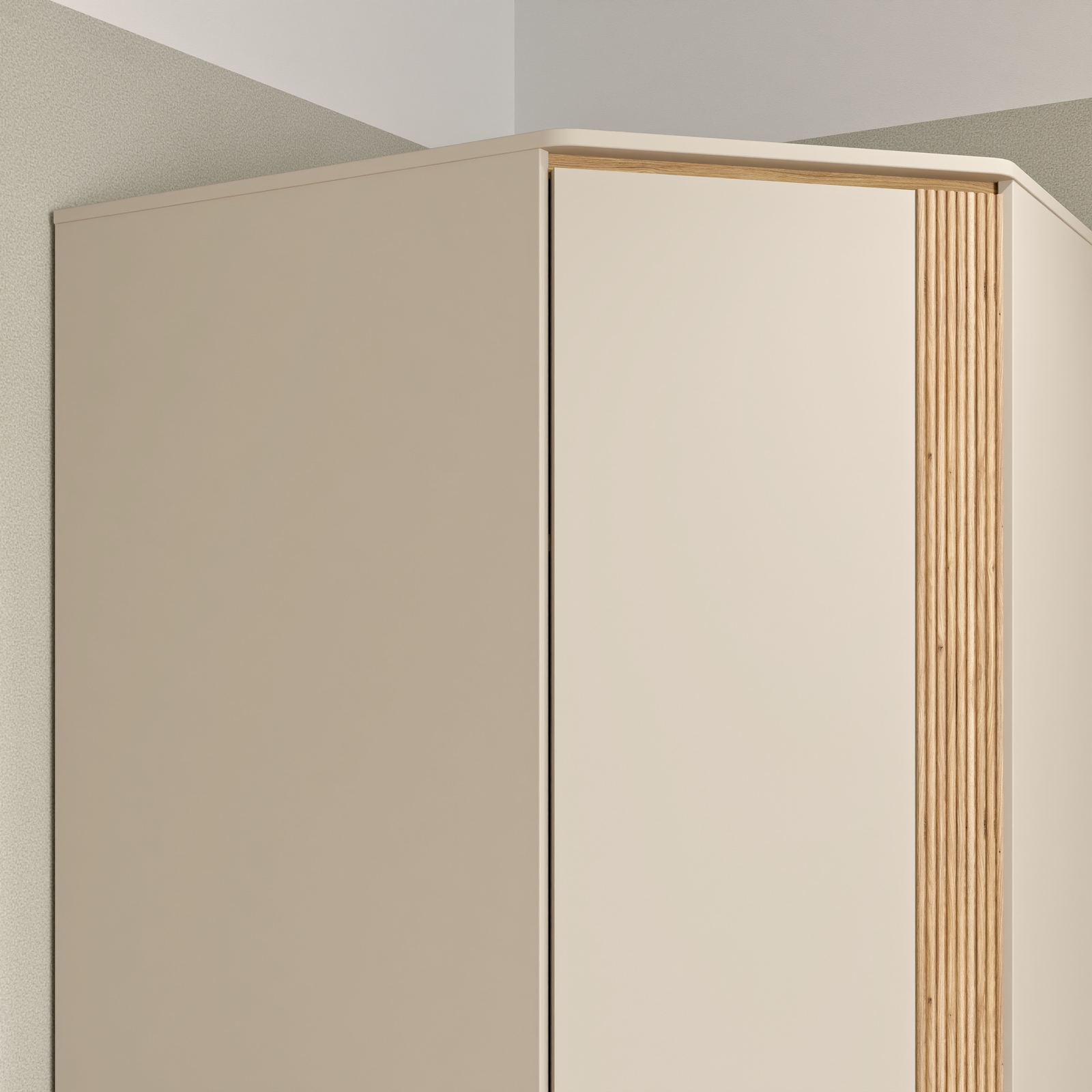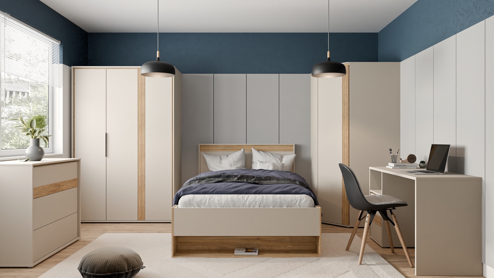 Szafa do pokoju młodzieży Wexlin została wykonana z laminowanej płyty wiórowej w dekorze dąb Mauvella połączonym z piaskowym korpusem, dzięki czemu harmonijnie wpisuje się w styl nowoczesnych, jasnych wnętrz. Obrzeża zostały starannie dopracowane, a frezowane elementy dodają całości elegancji. System otwierania Push to Open eliminuje potrzebę uchwytów, co podkreśla minimalistyczny charakter bryły i ułatwia codzienne użytkowanie.