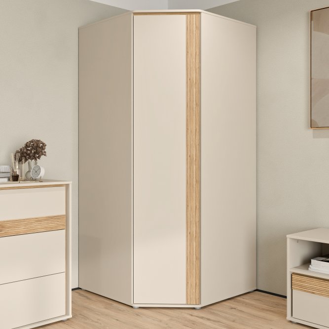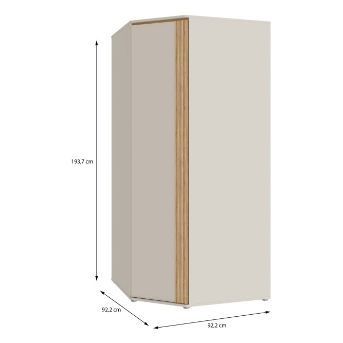 Dobrze zorganizowana przestrzeń to podstawa każdego pokoju młodzieżowego. Szafa narożna Wexlin to propozycja, która łączy estetykę i funkcjonalność, pomagając maksymalnie wykorzystać każdy metr powierzchni. Dzięki przemyślanej konstrukcji bez trudu zmieści się w rogu pomieszczenia, tworząc praktyczne miejsce do przechowywania ubrań i akcesoriów. Stonowana kolorystyka w odcieniach dąb Mauvella i piaskowym nadaje jej nowoczesnego, a zarazem przytulnego charakteru. Wzrok przyciąga pionowe frezowanie na froncie, które dodaje lekkości i elegancji. To mebel, który nie tylko porządkuje wnętrze, ale również stanowi jego subtelną ozdobę.