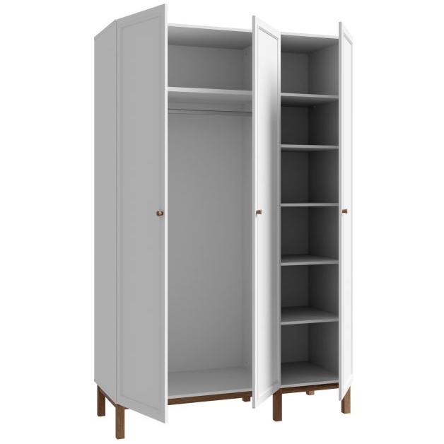 Korpus szafy ubraniowej Penkridge wykonano z płyty wiórowej w odcieniu Secret Grey, natomiast fronty stworzono z płyty MDF z subtelnymi ramkami, które nadają całości elegancji i delikatności. Stabilna podstawa z płyty MDF w kolorze dębu szlachetnego harmonijnie kontrastuje z jasnym korpusem, tworząc spójną i stylową kompozycję. Przemyślany układ wnętrza zapewnia komfortowe użytkowanie - część z drążkiem pozwala wygodnie przechowywać odzież wiszącą, a liczne półki boczne pomagają utrzymać porządek w ubraniach i dodatkach.