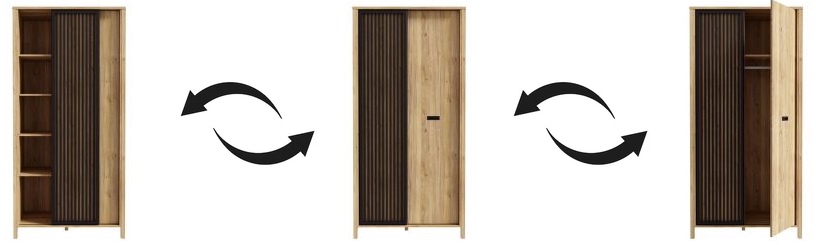 Nowoczesne wzornictwo w połączeniu z naturalnym wybarwieniem drewna sprawia, że szafa z kolekcji Jytana doskonale wpasuje się w eleganckie i modne wnętrza. Jej geometryczna forma, urozmaicona lamelowym frontem w kolorze czarnym, tworzy wyrazisty kontrast, który podkreśla charakter aranżacji. Szafa zachwyca prostotą, ale jednocześnie przyciąga uwagę detalem - to idealny wybór do wnętrz, w których liczy się styl, funkcjonalność i harmonia. Mebel doskonale sprawdzi się zarówno w sypialni, garderobie, jak i w nowoczesnym przedpokoju.