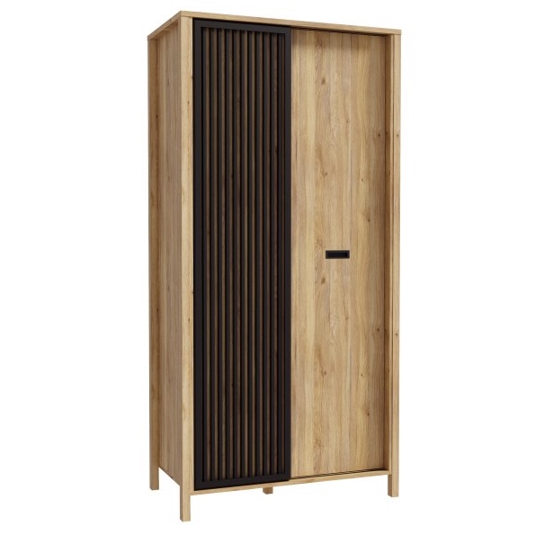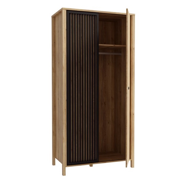 Korpus szafy ubraniowej Jytana wykonano z płyty wiórowej w dekorze dąb Mauvella, który doskonale imituje naturalne drewno i wprowadza do wnętrza ciepło oraz przytulność. Front lamelowy z płyty MDF w kolorze czarnym dodaje elegancji i nowoczesnego charakteru, tworząc efekt trójwymiarowej struktury. Obrzeże ABS dba o estetyczne wykończenie, a metalowy uchwyt stanowi stylowe dopełnienie całości.