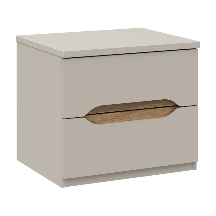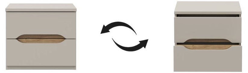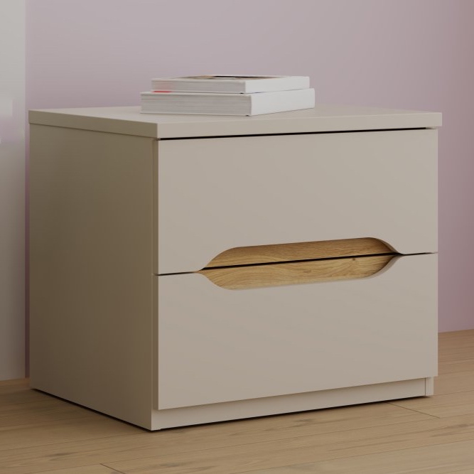 Subtelny beż w połączeniu z naturalnym dekorem dąb Mauvella tworzy harmonijny mebel, który doskonale uzupełni wystrój sypialni. Szafka nocna Edwal wyróżnia się prostą, nowoczesną formą, a jednocześnie wnosi do wnętrza przytulny akcent dzięki drewnianemu wstawieniu we froncie. Niewielkie rozmiary czynią ją praktycznym towarzyszem łóżka, zapewniającym wygodne miejsce do przechowywania i odkładania przedmiotów codziennego użytku. Jej stonowana kolorystyka świetnie sprawdza się w aranżacjach minimalistycznych, skandynawskich czy nowoczesnych, podkreślając spójny charakter wnętrza.