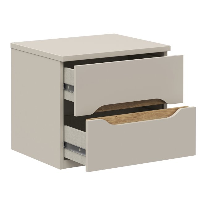 Szafkę nocną Edwal wykonano z beżowej, laminowanej płyty wiórowej, dzięki czemu uzyskano estetyczny wygląd i jednolitą strukturę. Fronty zdobi charakterystyczna wstawka w dekorze dąb Mauvella, która ociepla całość i podkreśla naturalne inspiracje projektu. Dzięki zastosowanym prowadnicom kulkowym szuflady otwierają się lekko i wygodnie, co podnosi komfort użytkowania.
