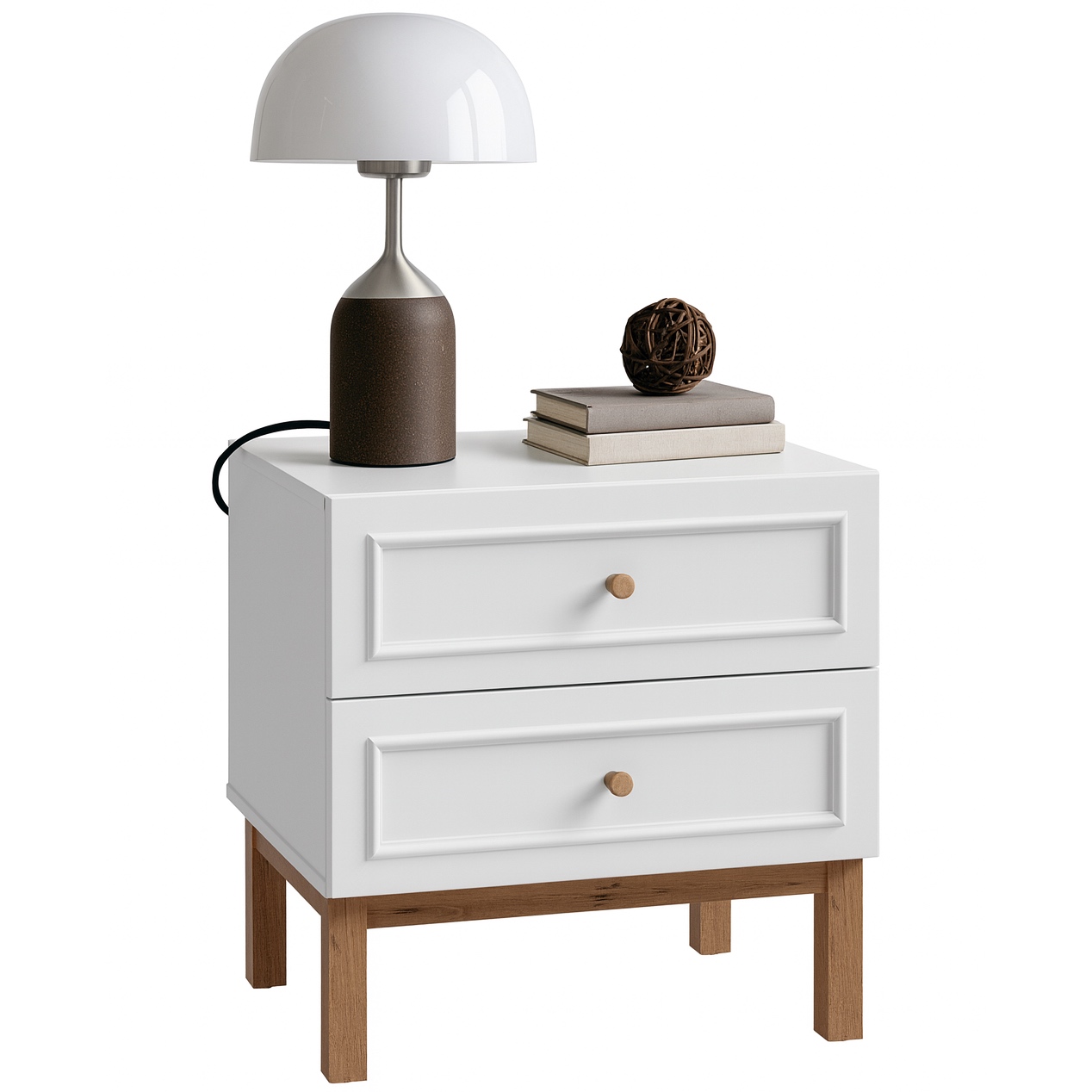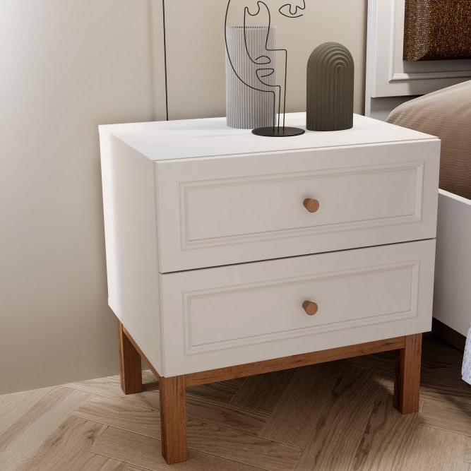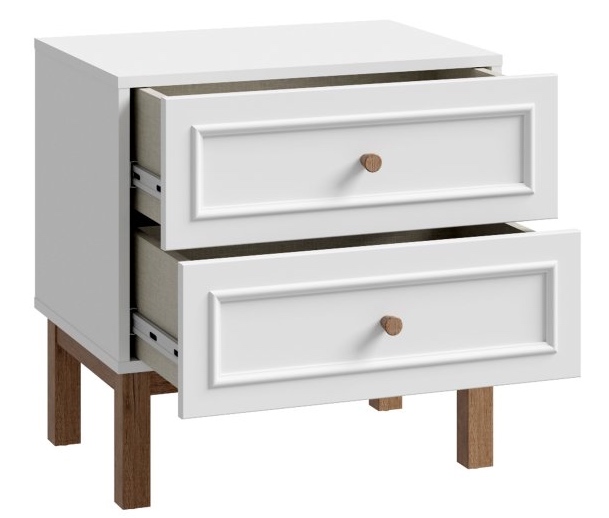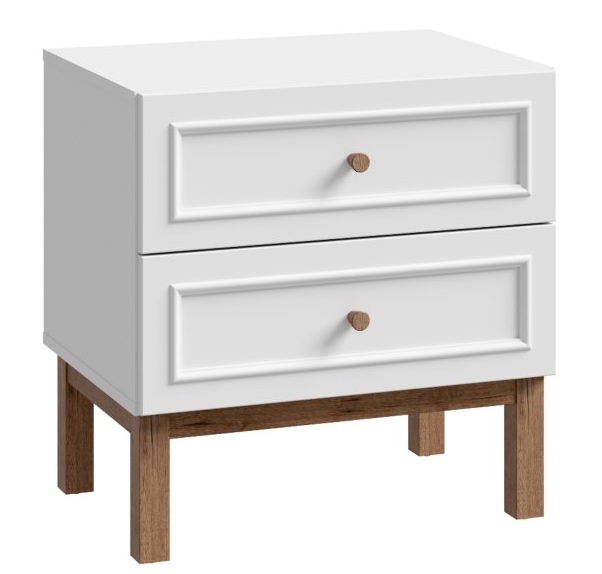 Korpus szafki do sypialni Penkridge wykonano z laminowanej płyty meblowej w odcieniu Secret Grey, a fronty z płyty MDF ozdobiono cienkimi ramkami, które subtelnie nawiązują do stylu angielskiego. Całość uzupełnia podstawa z płyty MDF w kolorze dąb szlachetny, nadająca meblowi lekkości i naturalnego ciepła. Precyzyjnie dopasowane elementy oraz staranne wykończenie sprawiają, że szafka świetnie komponuje się zarówno z nowoczesnym wystrojem, jak i z klasycznymi wnętrzami o spokojnym charakterze.