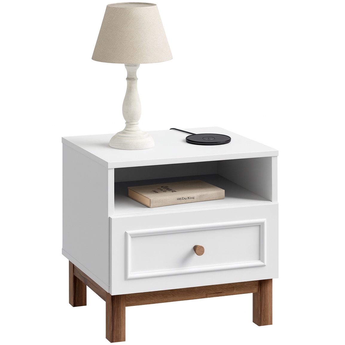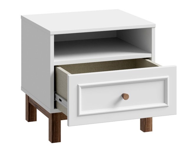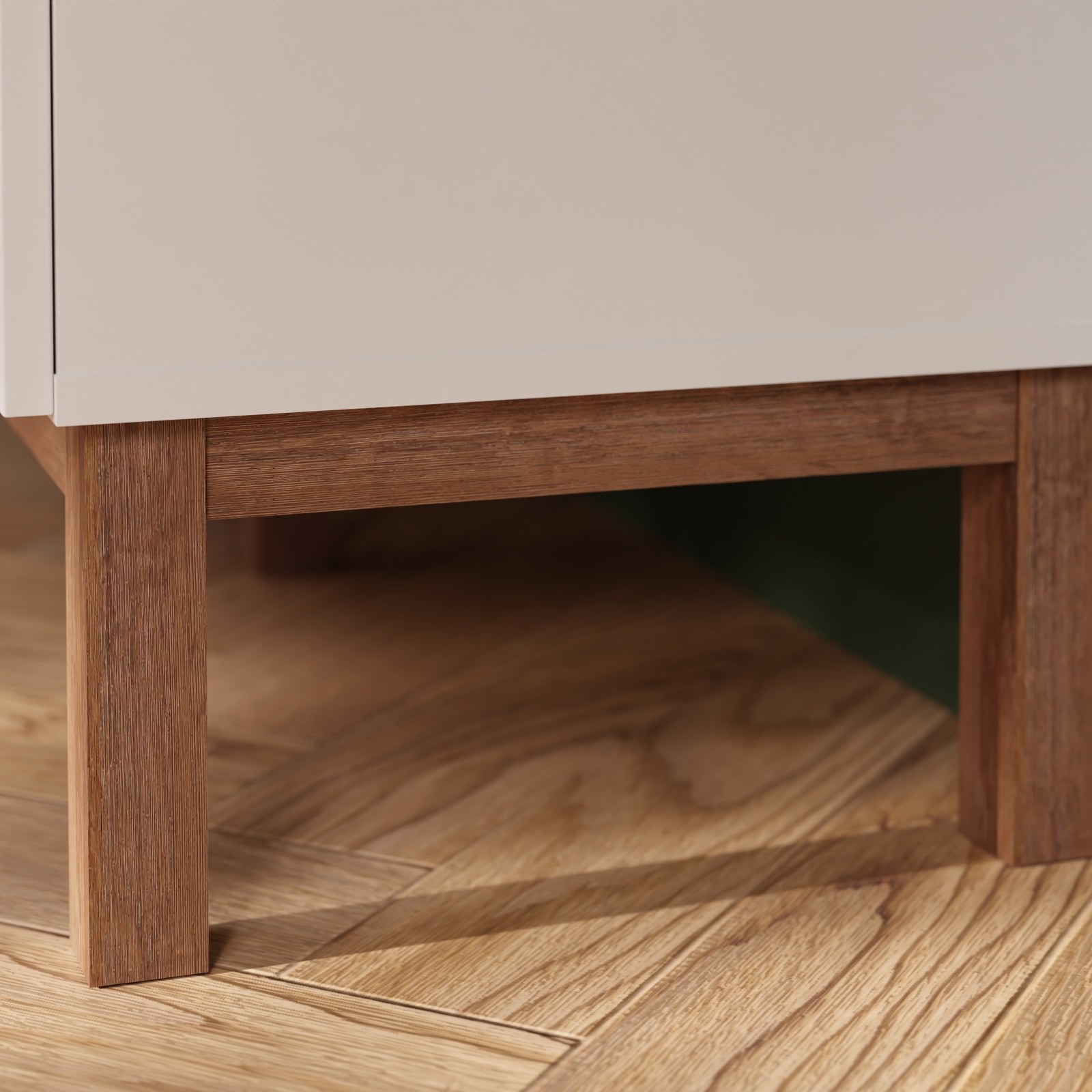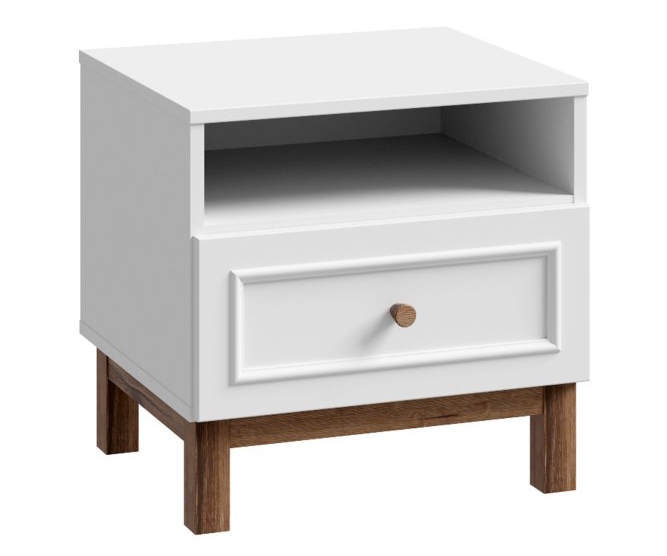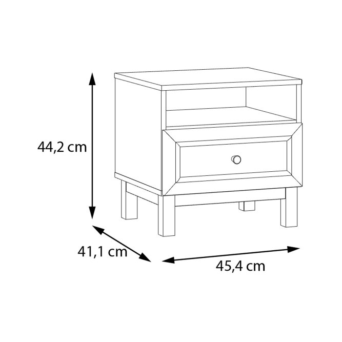 Korpus stolika nocnego Penkridge wykonano z laminowanej płyty wiórowej w eleganckim odcieniu Secret Grey, natomiast front oraz podstawa powstały z płyty MDF, co nadaje całości wyrafinowany wygląd. Obrzeża zabezpieczono warstwą ABS, podkreślając staranne wykończenie i dbałość o detale. Neutralną kolorystykę przełamują drewnopodobne wstawki dąb szlachetny. Prosta forma mebla została przełamana stylową ramką, która przypomina subtelną sztukaterię, nadając konstrukcji lekkości i wdzięku.