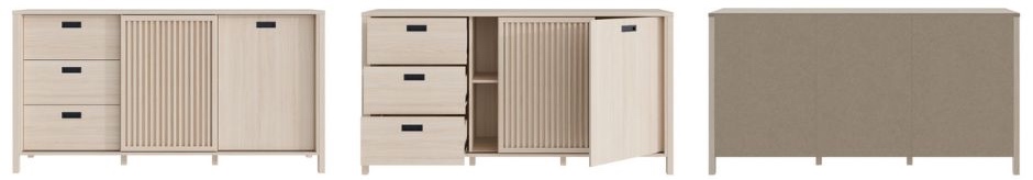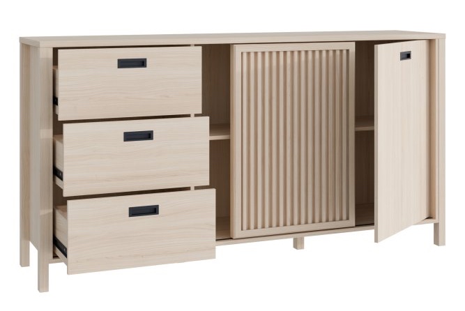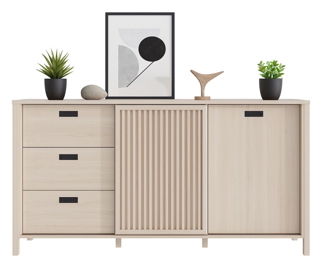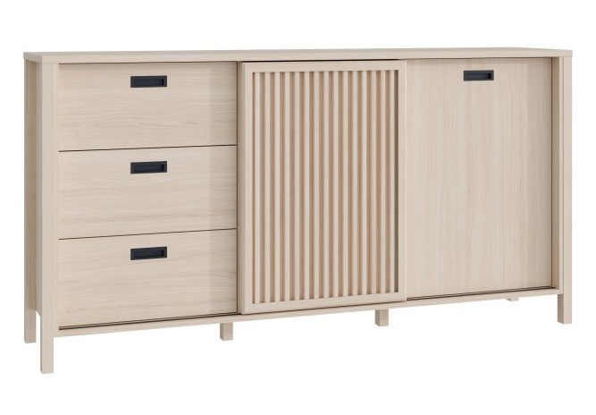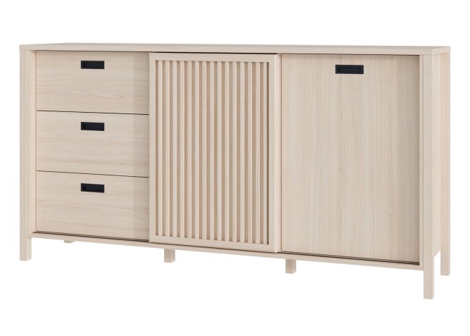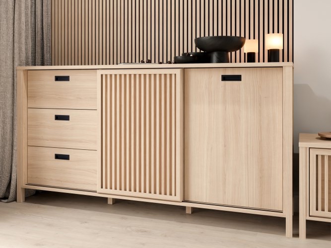 Nowoczesna elegancja w naturalnym wydaniu - tak najlepiej opisać komodę z kolekcji Jytana, która łączy funkcjonalność z subtelnym, skandynawskim stylem! Jasny dekor dąb Riva wprowadza do wnętrza przytulność i harmonię, a lamelowy front dodaje całości lekkości i dekoracyjnego charakteru. To mebel, który doskonale odnajdzie się zarówno w salonie, jak i w sypialni czy jadalni, oferując mnóstwo przestrzeni do przechowywania w eleganckiej formie.