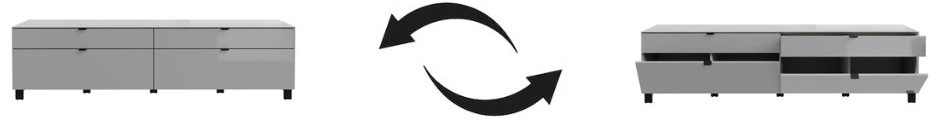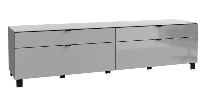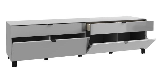 Do produkcji szafki RTV Poole wykorzystano szarą płytę wiórową, a powierzchnię frontów i wieńca górnego wykończono szkłem Opti w odcieniu jasnoszarym, które efektownie odbija światło i nadaje meblowi połysk. Obrzeża wzmocniono warstwą ABS, co zwiększa estetykę i dbałość o detale. Szafka stoi na stabilnych nóżkach wykonanych z tworzywa sztucznego w kolorze czarnym, a całość dopełniają metalowe uchwyty w tym samym wybarwieniu.