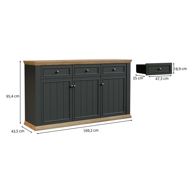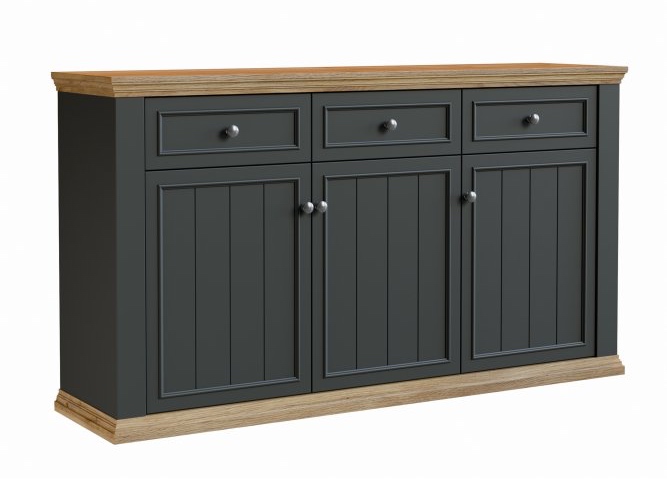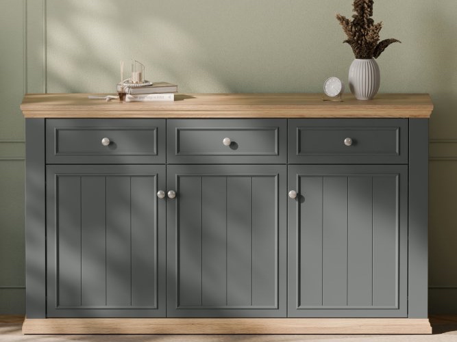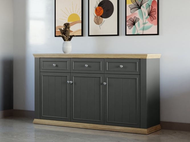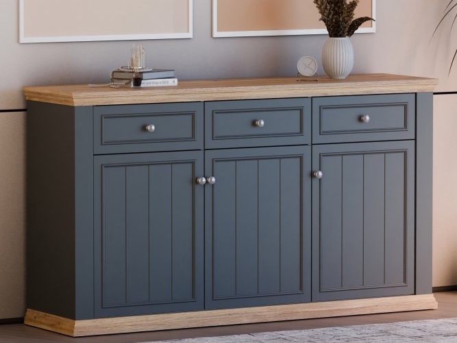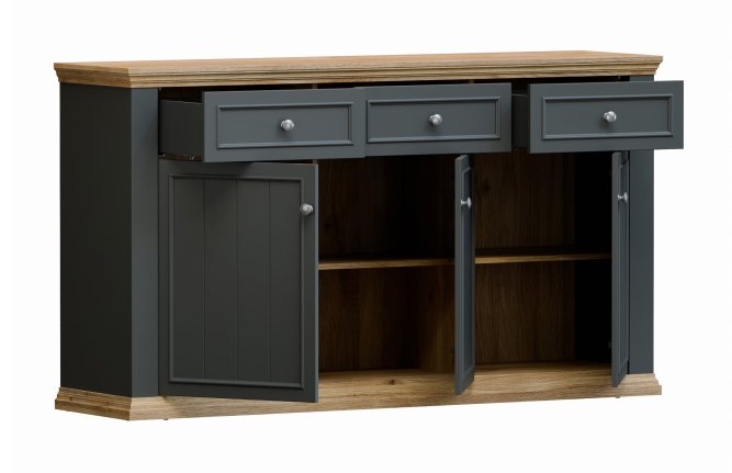 Korpus komody do salonu Pontypool wykonano z płyty wiórowej, a fronty z płyty MDF, co pozwala uzyskać elegancki efekt frezowań i subtelnych detali. Połączenie naturalnego rysunku drewna dąb Mauvella z głębokim, matowym odcieniem Uni Wolfram Szary tworzy stylowy kontrast, który doskonale współgra z nowoczesnymi aranżacjami. Proporcjonalna forma mebla zapewnia wygodę użytkowania, a jego funkcjonalne wnętrze pomaga utrzymać porządek w domu.