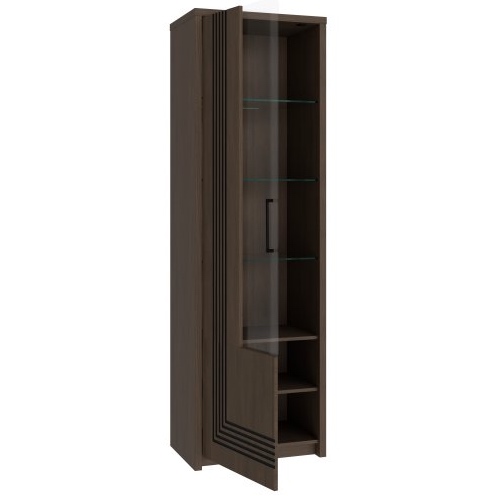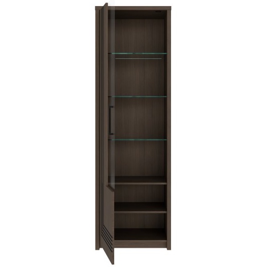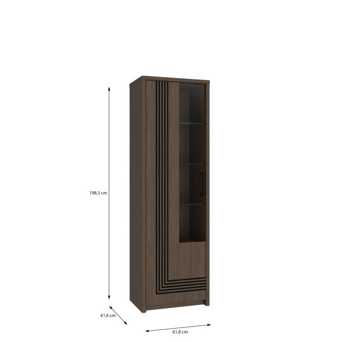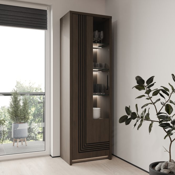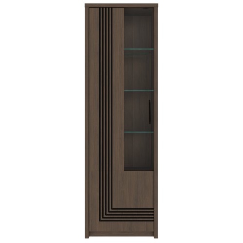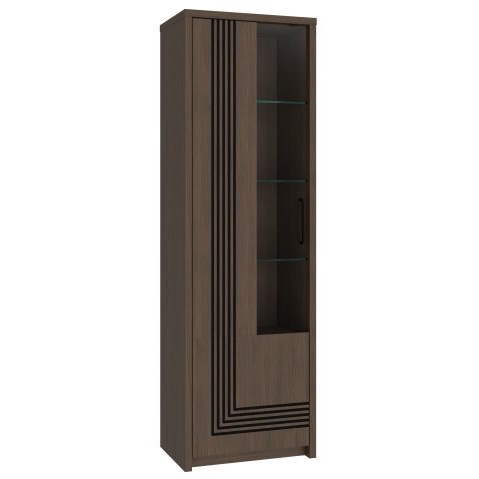 Stylowa witryna z kolekcji Eufemius to doskonałe rozwiązanie do nowoczesnych i eleganckich wnętrz. Dzięki smukłej formie nie zajmuje wiele miejsca, a jednocześnie zapewnia sporo przestrzeni do przechowywania. Połączenie dekoru Dąb Mazurski z charakterystycznymi lamelami nadaje jej wyjątkowego charakteru, podkreślając jednocześnie współczesny design mebla. Transparentne szkło pozwala efektownie wyeksponować dekoracje, szkło lub książki, czyniąc z witryny praktyczny, a zarazem dekoracyjny element wyposażenia salonu.