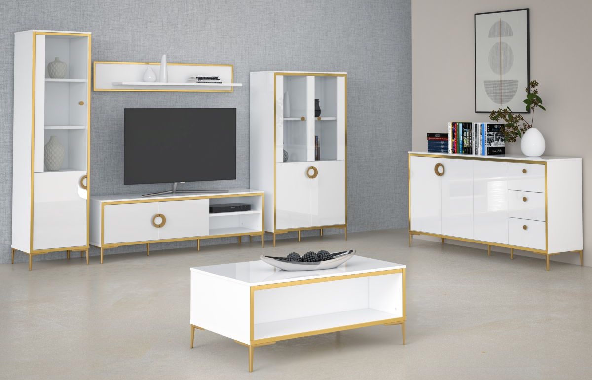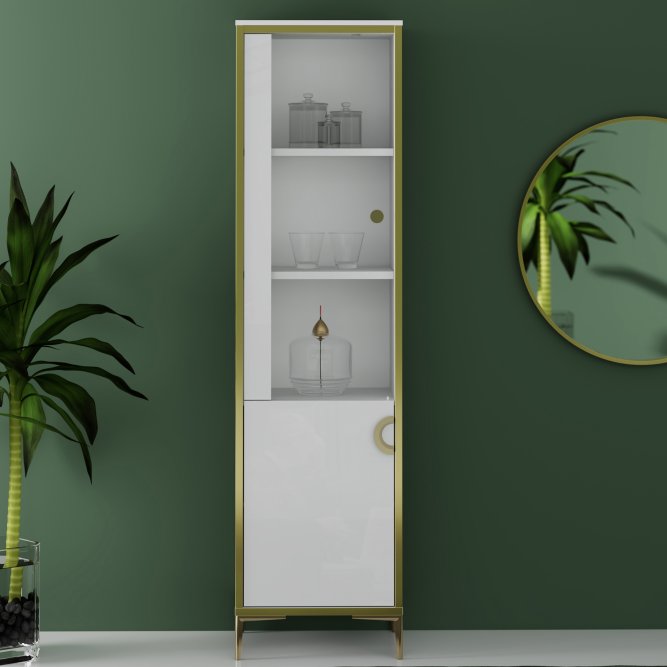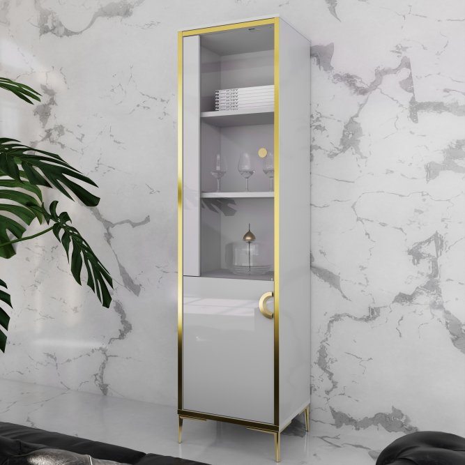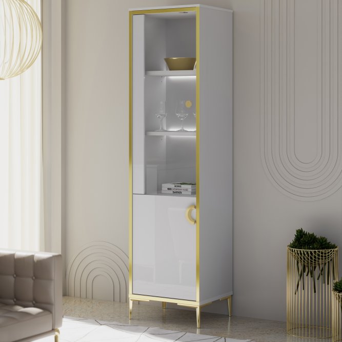 Subtelny blask i elegancka forma sprawiają, że witryna z kolekcji Golden 2 doskonale wkomponuje się w aranżacje inspirowane stylem glamour, nowoczesnym lub klasycznym. To mebel, który przyciąga uwagę dzięki kontrastowi między białym połyskiem a złotymi detalami, wprowadzając do wnętrza wrażenie luksusu i lekkości. Smukła konstrukcja sprawia, że witryna nie przytłacza przestrzeni, a jednocześnie oferuje wiele możliwości ekspozycji i przechowywania. Idealnie zaprezentuje porcelanę, szkło lub dekoracje, nadając wnętrzu wyjątkowego charakteru.
