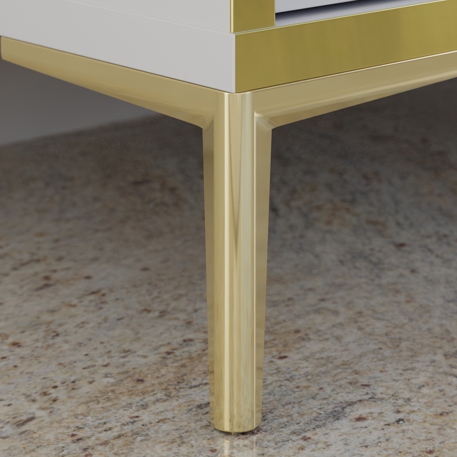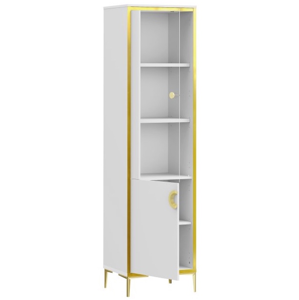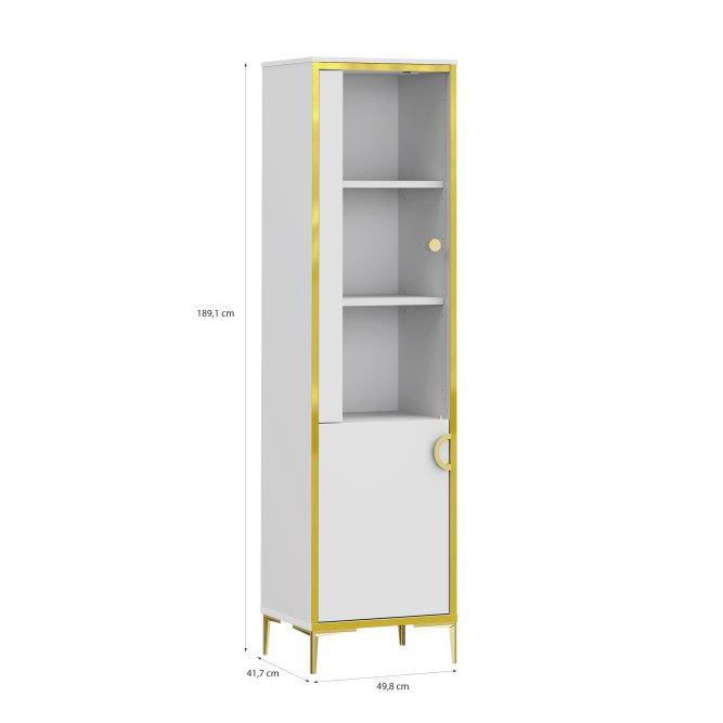 Fronty witryny Golden 2 wykonano z płyty wiórowej w białym połysku, który pięknie odbija światło i rozświetla wnętrze. Korpus utrzymano w matowym wykończeniu, co tworzy elegancki kontrast i podkreśla nowoczesny charakter mebla. Delikatna, złota ramka oraz metalowe nogi w tym samym kolorze dodają całości klasy i szyku. Przeszklona część witryny pozwala na efektowne wyeksponowanie ozdobnych elementów, a dolna półka ukryta za drzwiami zapewnia miejsce na przedmioty, które warto mieć pod ręką.