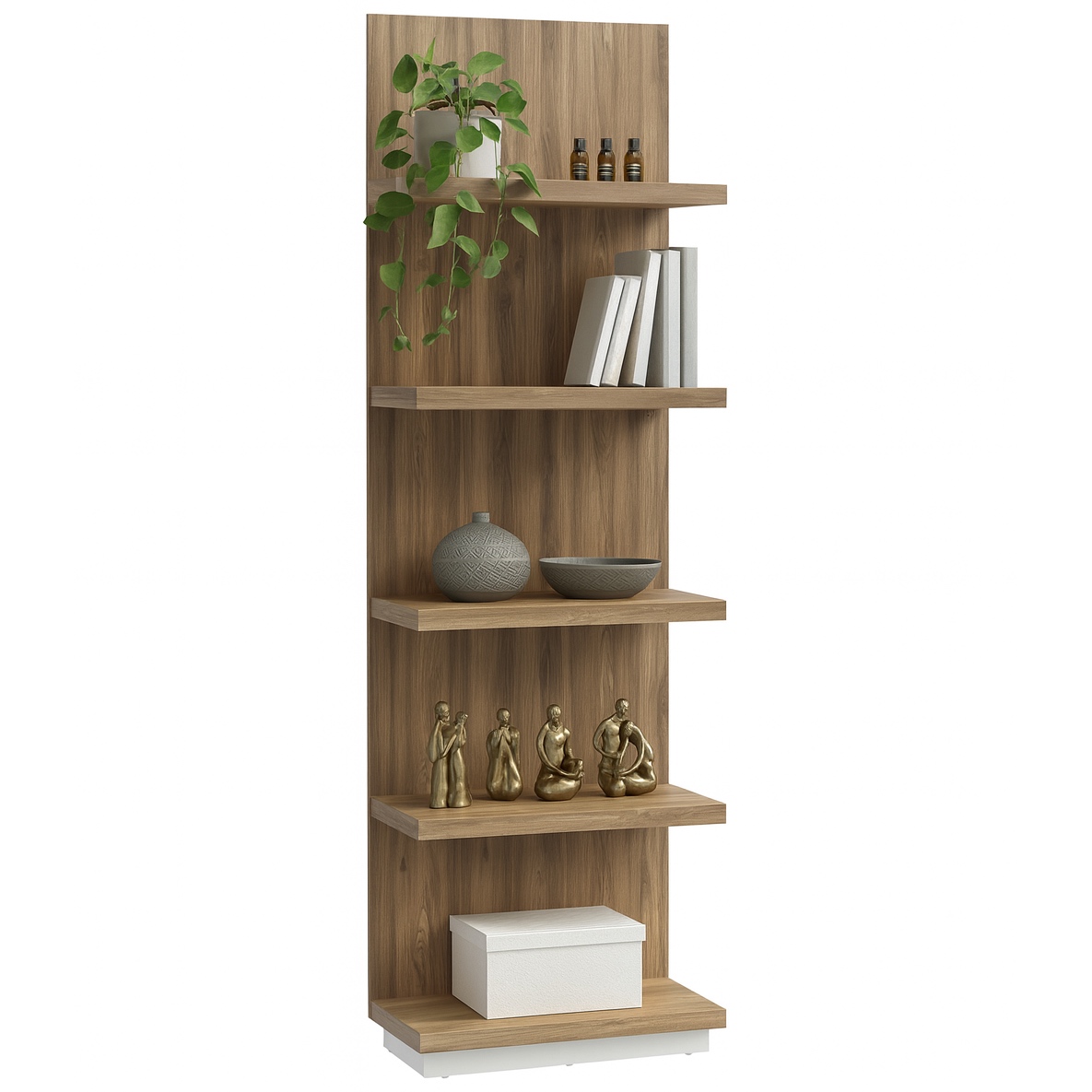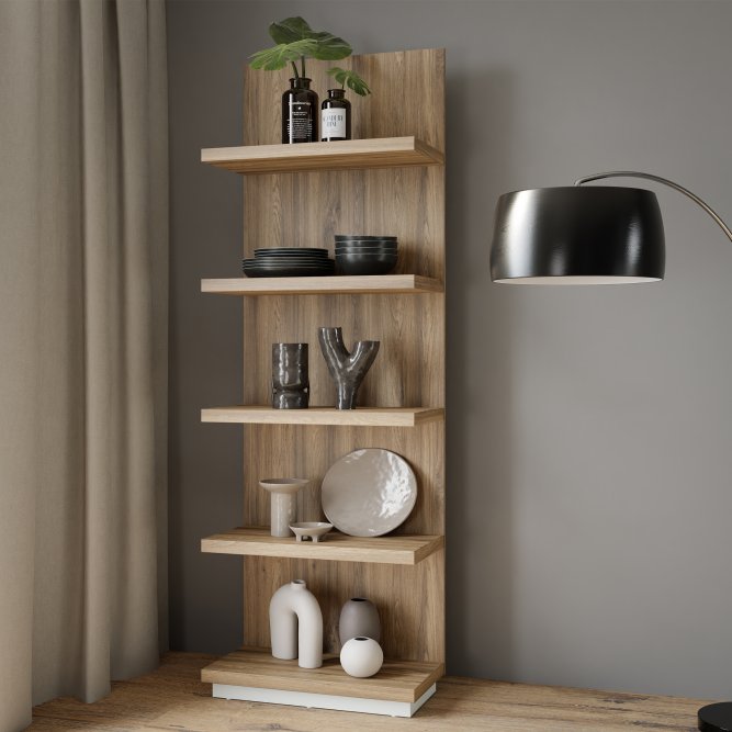 Regał na książki i dekoracje Lewisville wykonano z laminowanej płyty wiórowej, dzięki czemu jego powierzchnia zachowuje estetyczny wygląd i jest łatwa w pielęgnacji. Drewnopdoobny odcień dębu Valencia doskonale komponuje się z nowoczesnymi, skandynawskimi i klasycznymi wnętrzami, wnosząc do nich lekkość i naturalny urok.